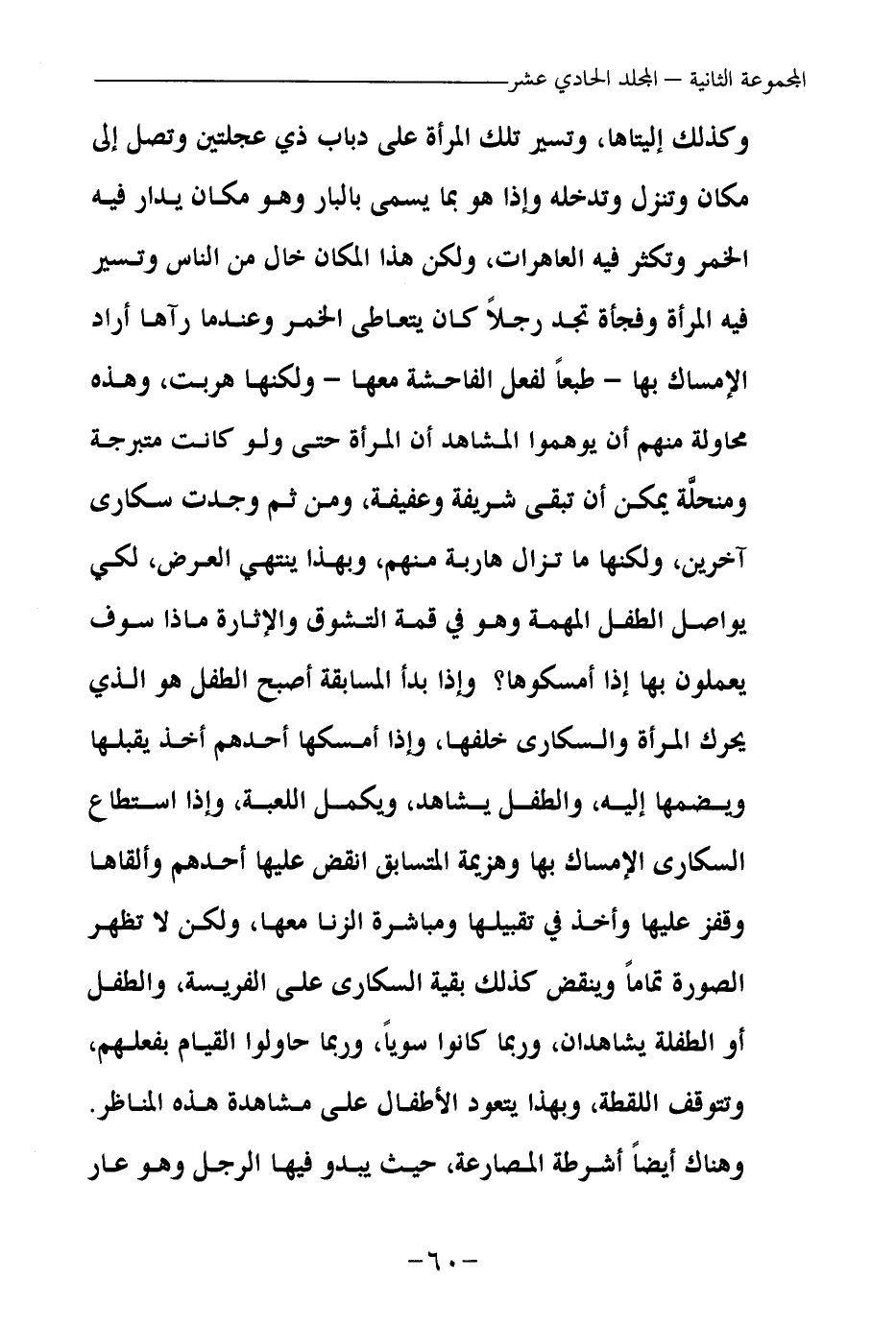 وكذلك إليتاها، وتسير تلك المرأة على دباب ذي عجلتين وتصل إلى مكان وتنزل وتدخله وإذا هو بما يسمى بالبار وهو مكان يدار فيه الخمر وتكثر فيه العاهرات، ولكن هذا المكان خال من الناس وتسير فيه المرأة وفجأة تجد رجلا كان يتعاطى الخمر وعندما رآها أراد الإمساك بها ـ طبعا لفعل الفاحشة معها ـ ولكنها هربت، وهذه محاولة منهم أن يوهموا المشاهد أن المرأة حتى ولو كانت متبرجة ومنحلة يمكن أن تبقى شريفة وعفيفة، ومن ثم وجدت سكارى آخرين، ولكنها ما تزال هاربة منهم، وبهذا ينتهي العرض، لكي يواصل الطفل المهمة وهو في قمة التشوق والإثارة ماذا سوف يعملون بها إذا أمسكوها؟ وإذا بدأ المسابقة أصبح الطفل هو الذي يحرك المرأة والسكارى خلفها، وإذا أمسكها أحدهم أخذ يقبلها ويضمها إليه، والطفل يشاهد، ويكمل اللعبة، وإذا استطاع السكارى الإمساك بها وهزيمة المتسابق انقض عليها أحدهم وألقاها وقفز عليها وأخذ في تقبيلها ومباشرة الزنى معها، ولكن لا تظهر الصورة تماما وينقض كذلك بقية السكارى على الفريسة، والطفل أو الطفلة يشاهدان، وربما كانوا سويا، وربما حاولوا القيام بفعلهم، وتتوقف اللقطة، وبهذا يتعود الأطفال على مشاهدة هذه المناظر. وهناك أيضا أشرطة المصارعة، حيث يبدو فيها الرجل وهو عار