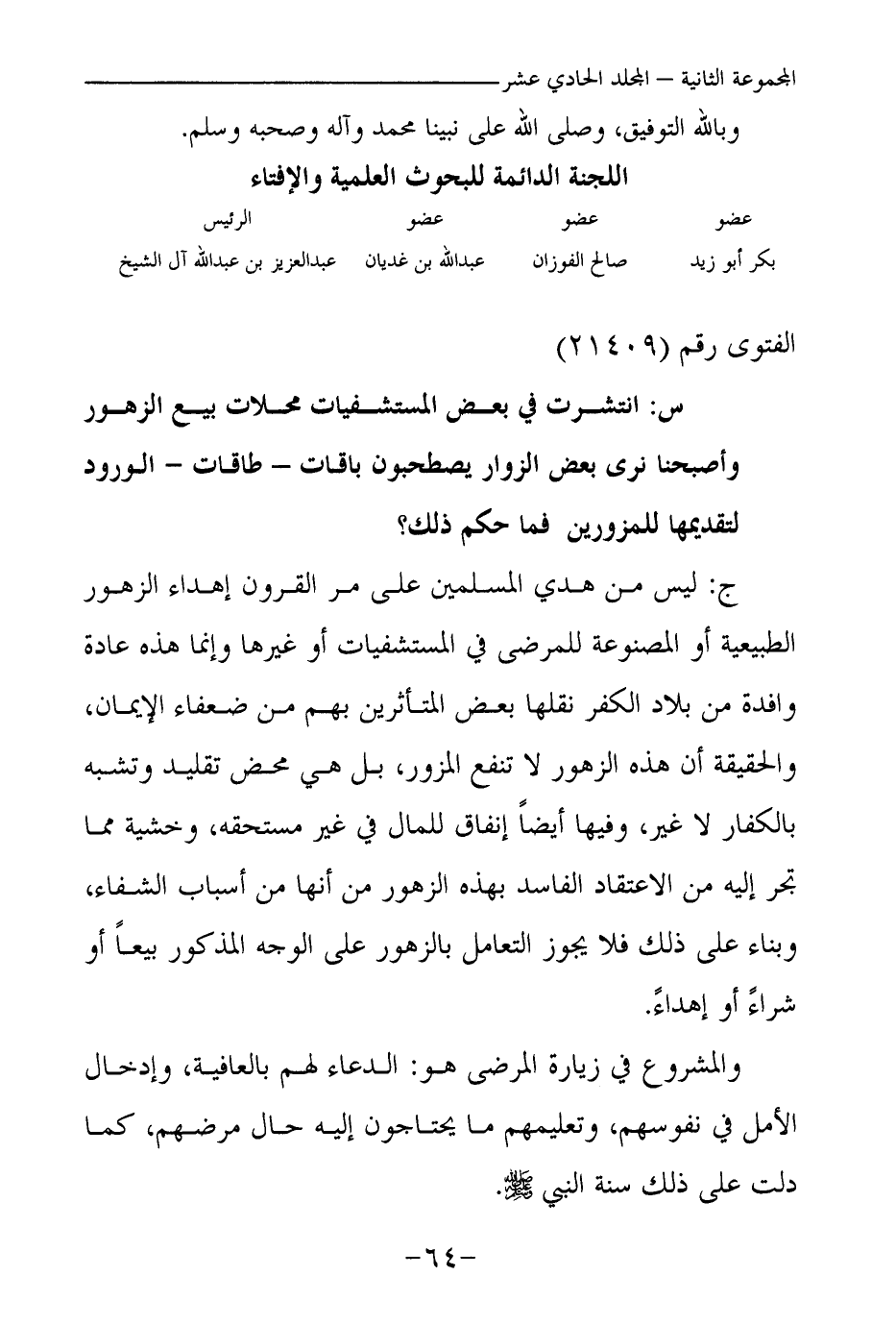 ج: ليس من هدي المسلمين على مر القرون إهداء الزهور الطبيعية أو المصنوعة للمرضى في المستشفيات أو غيرها وإنما هذه عادة وافدة من بلاد الكفر نقلها بعض المتأثرين بهم من ضعفاء الإيمان، والحقيقة أن هذه الزهور لا تنفع المزور، بل هي محض تقليد وتشبه بالكفار لا غير، وفيها أيضا إنفاق للمال في غير مستحقه، وخشية مما تجر إليه من الاعتقاد الفاسد بهذه الزهور من أنها من أسباب الشفاء، وبناء على ذلك فلا يجوز التعامل بالزهور على الوجه المذكور بيعا أو شراء أو إهداء.
