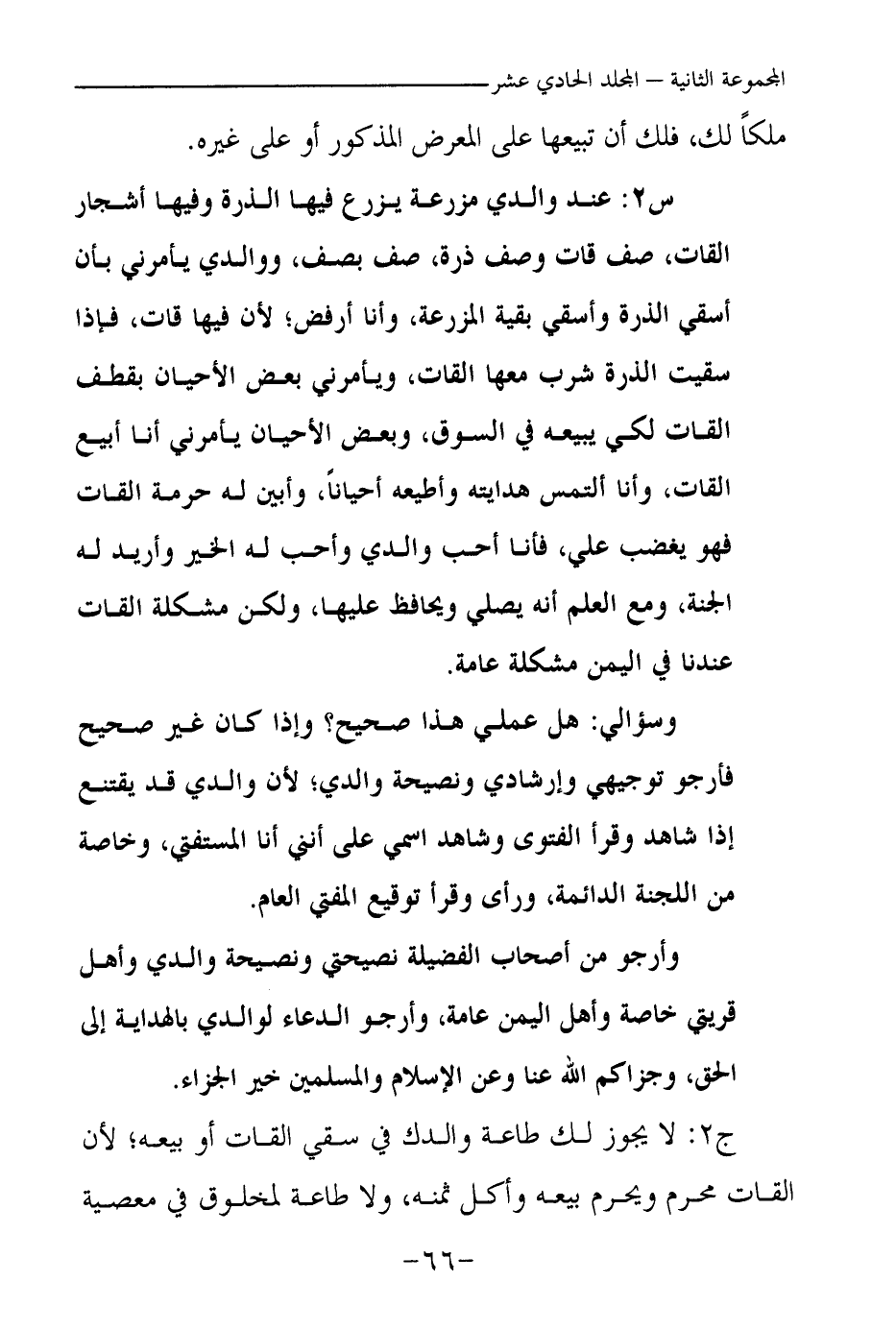 س2: عند والدي مزرعة يزرع فيها الذرة وفيها أشجار القات، صف قات وصف ذرة، صف بصف، ووالدي يأمرني بأن أسقي الذرة وأسقي بقية المزرعة، وأنا أرفض؛ لأن فيها قاتا، فإذا سقيت الذرة شرب معها القات، ويأمرني بعض الأحيان بقطف القات لكي يبيعه في السوق، وبعض الأحيان يأمرني أنا أبيع القات، وأنا ألتمس هدايته وأطيعه أحيانا، وأبين له حرمة القات فهو يغضب علي، فأنا أحب والدي وأحب له الخير وأريد له الجنة، ومع العلم أنه يصلي ويحافظ عليها، ولكن مشكلة القات عندنا في اليمن مشكلة عامة.