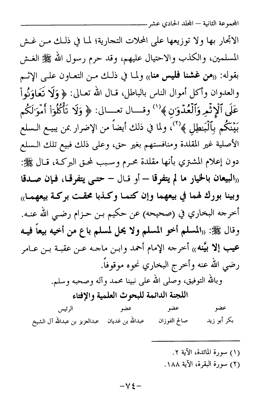 الاتجار بها ولا توزيعها على المحلات التجارية؛ لما في ذلك من غش المسلمين، والكذب والاحتيال عليهم، وقد حرم رسول الله - صلى الله عليه وسلم - الغش بقوله: «من غشنا فليس منا (¬1) » ولما في ذلك من التعاون على الإثم والعدوان وأكل أموال الناس بالباطل، قال الله تعالى: {وَلَا تَعَاوَنُوا عَلَى الْإِثْمِ وَالْعُدْوَانِ} (¬2) ، وقال تعالى: {وَلَا تَأْكُلُوا أَمْوَالَكُمْ بَيْنَكُمْ بِالْبَاطِلِ} (¬3) ، ولما في ذلك أيضا من الإضرار بمن يبيع السلع الأصلية غير المقلدة ومنافستهم بغير حق، وعلى ذلك فبيع تلك السلع دون إعلام المشتري بأنها مقلدة محرم وسبب لمحق البركة، قال - صلى الله عليه وسلم -: «البيعان بالخيار ما لم يتفرقا ـ أو قال ـ حتى يتفرقا، فإن صدقا وبينا بورك لهما في بيعهما وإن كتما وكذبا محقت بركة بيعهما (¬4) » أخرجه البخاري في (صحيحه) عن حكيم بن حزام _ رضي الله عنه _ وقال - صلى الله عليه وسلم -: «المسلم أخو المسلم ولا يحل لمسلم باع من أخيه بيعا فيه عيب إلا بينه (¬5) » أخرجه الإمام أحمد وابن ماجه عن عقبة بن عامر _ رضي الله عنه _ وأخرج البخاري نحوه موقوفا.