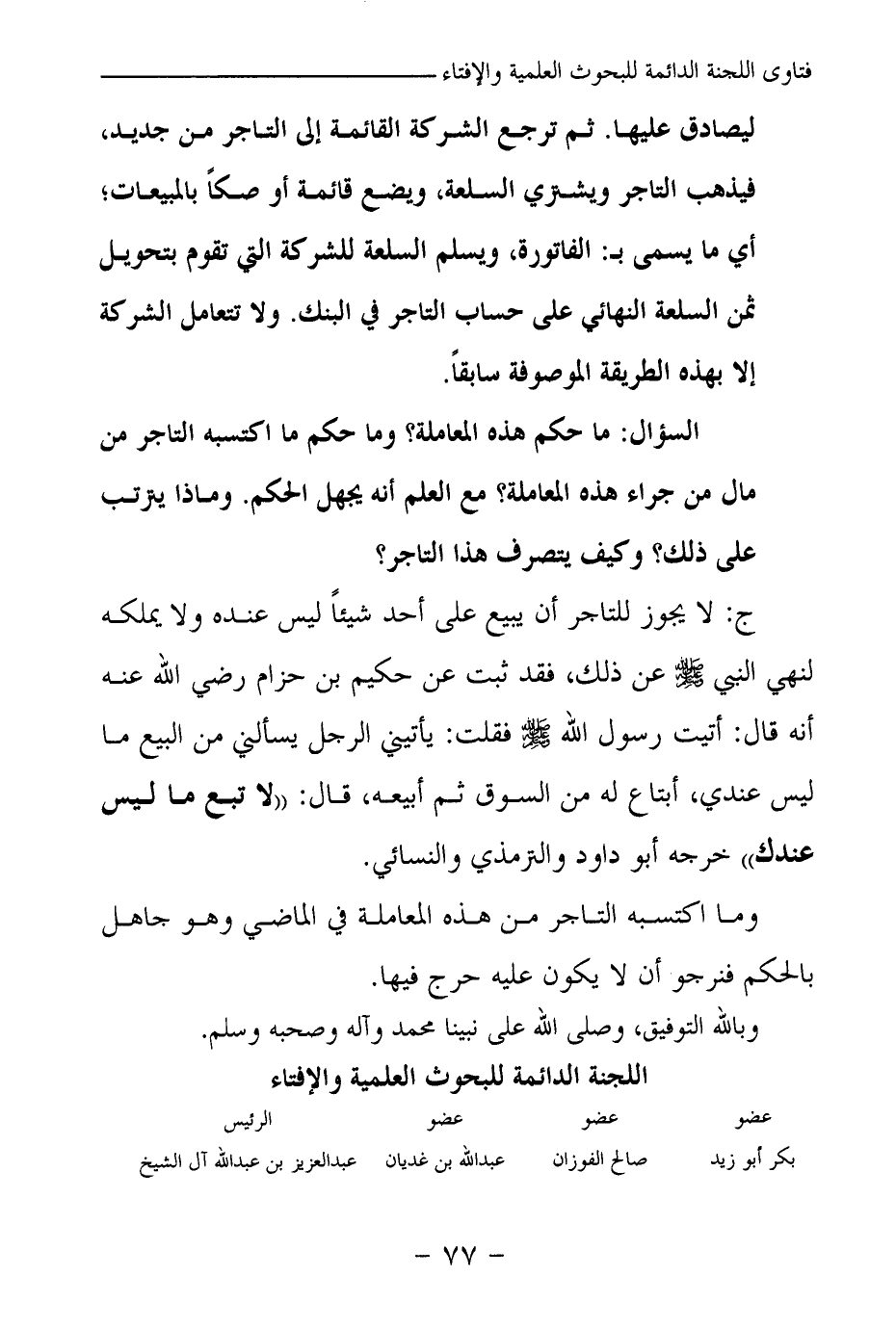ليصادق عليها. ثم ترجع الشركة القائمة إلى التاجر من جديد، فيذهب التاجر ويشتري السلعة، ويضع قائمة أو صكا بالمبيعات؛ أي ما يسمى بـ: الفاتورة، ويسلم السلعة للشركة التي تقوم بتحويل ثمن السلعة النهائي على حساب التاجر في البنك. ولا تتعامل الشركة إلا بهذه الطريقة الموصوفة سابقا.
