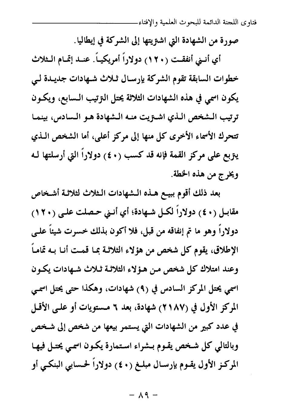بعد ذلك أقوم ببيع هذه الشهادات الثلاث لثلاثة أشخاص مقابل (40) دولارا لكل شهادة؛ أي أنني حصلت على (120) دولارا وهو ما تم إنفاقه من قبل، فلا أكون بذلك خسرت شيئا على الإطلاق، يقوم كل شخص من هؤلاء الثلاثة بما قمت أنا به تماما وعند امتلاك كل شخص من هؤلاء الثلاثة ثلاث شهادات يكون اسمي يحتل المركز السادس في (9) شهادات، وهكذا حتى يحتل اسمي المركز الأول في (2187) شهادة، بعد 6 مستويات أو على الأقل في عدد كبير من الشهادات التي يستمر بيعها من شخص إلى شخص وبالتالي كل شخص يقوم بشراء استمارة يكون اسمي يحتل فيها المركز الأول يقوم بإرسال مبلغ (40 دولارا) لحسابي البنكي أو