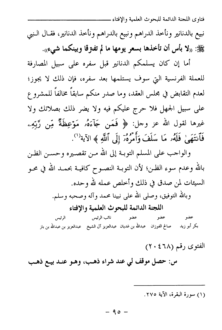 أما إن كان يسلمكم الدنانير قبل سفره على سبيل المصارفة للعملة الفرنسية التي سوف يستلمها بعد سفره، فإن ذلك لا يجوز؛ لعدم التقابض في مجلس العقد، وما صدر منكم سابقا مخالفا للمشروع على سبيل الجهل فلا حرج عليكم فيه ولا يضر ذلك بصلاتك ولا غيرها لقول الله عز وجل: {فَمَنْ جَاءَهُ مَوْعِظَةٌ مِنْ رَبِّهِ فَانْتَهَى فَلَهُ مَا سَلَفَ وَأَمْرُهُ إِلَى اللَّهِ} (¬2) الآية.
