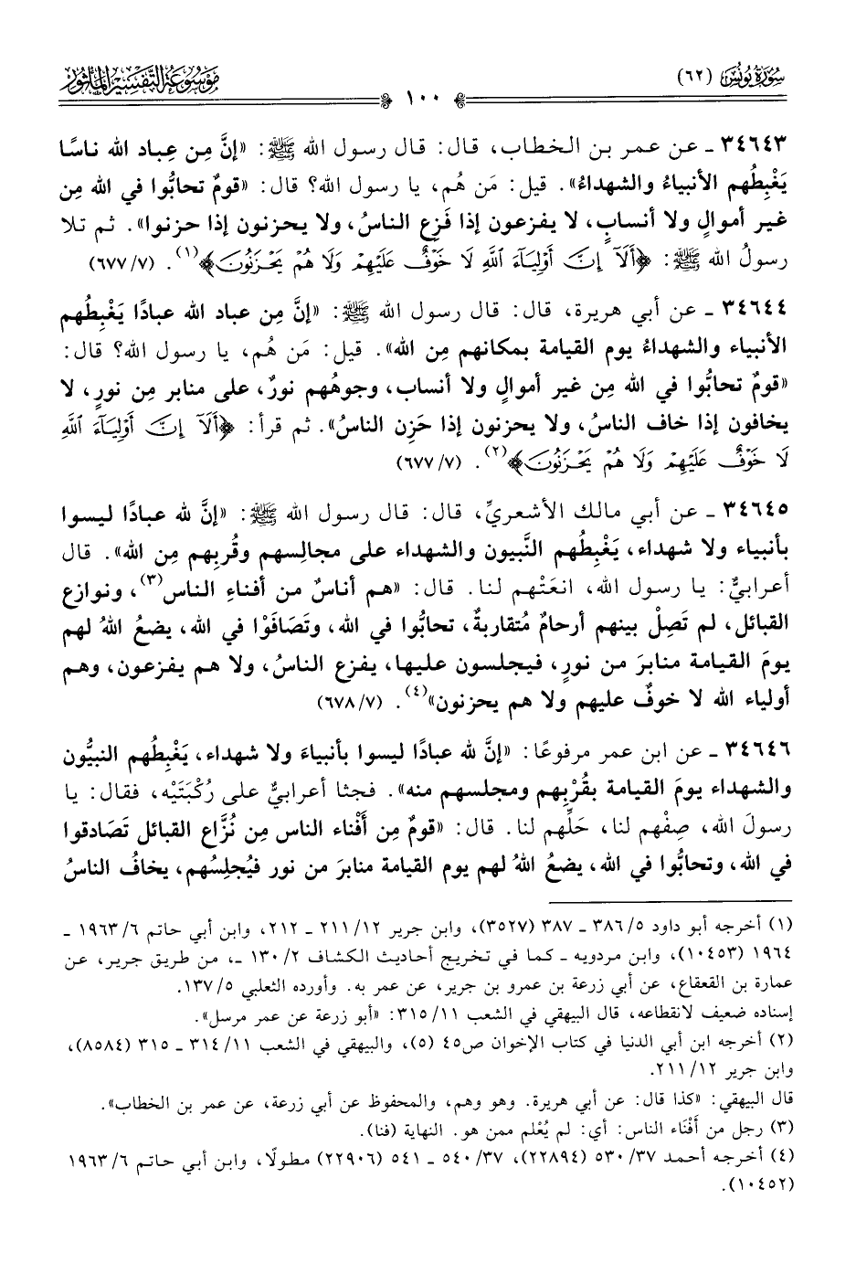 ٣٤٦٤٣ - عن عمر بن الخطاب، قال: قال رسول الله - صلى الله عليه وسلم -: «إنّ مِن عِباد الله ناسًا يَغْبِطُهم الأنبياءُ والشهداءُ». قيل: مَن هُم، يا رسول الله؟ قال: «قومٌ تحابُّوا في الله مِن غير أموالٍ ولا أنسابٍ، لا يفزعون إذا فَزِع الناسُ، ولا يحزنون إذا حزنوا». ثم تلا رسولُ الله - صلى الله عليه وسلم -: {ألا إن أولياءَ الله لا خوفٌ عليهم ولا هم يحزنونَ} (¬١). (٧/ ٦٧٧)