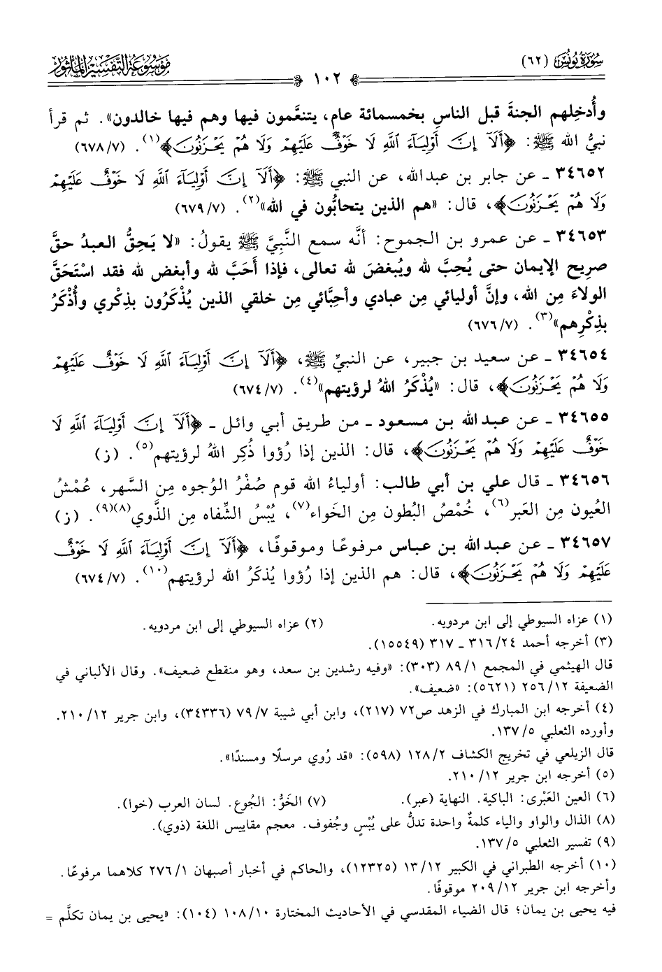 ٣٤٦٥٢ - عن جابر بن عبد الله، عن النبي - صلى الله عليه وسلم -: {ألا إنّ أولياء الله لا خوفٌ عليهمْ ولا هم يحزنونَ}، قال: «هم الذين يتحابُّون في الله» (¬٢). (٧/ ٦٧٩)