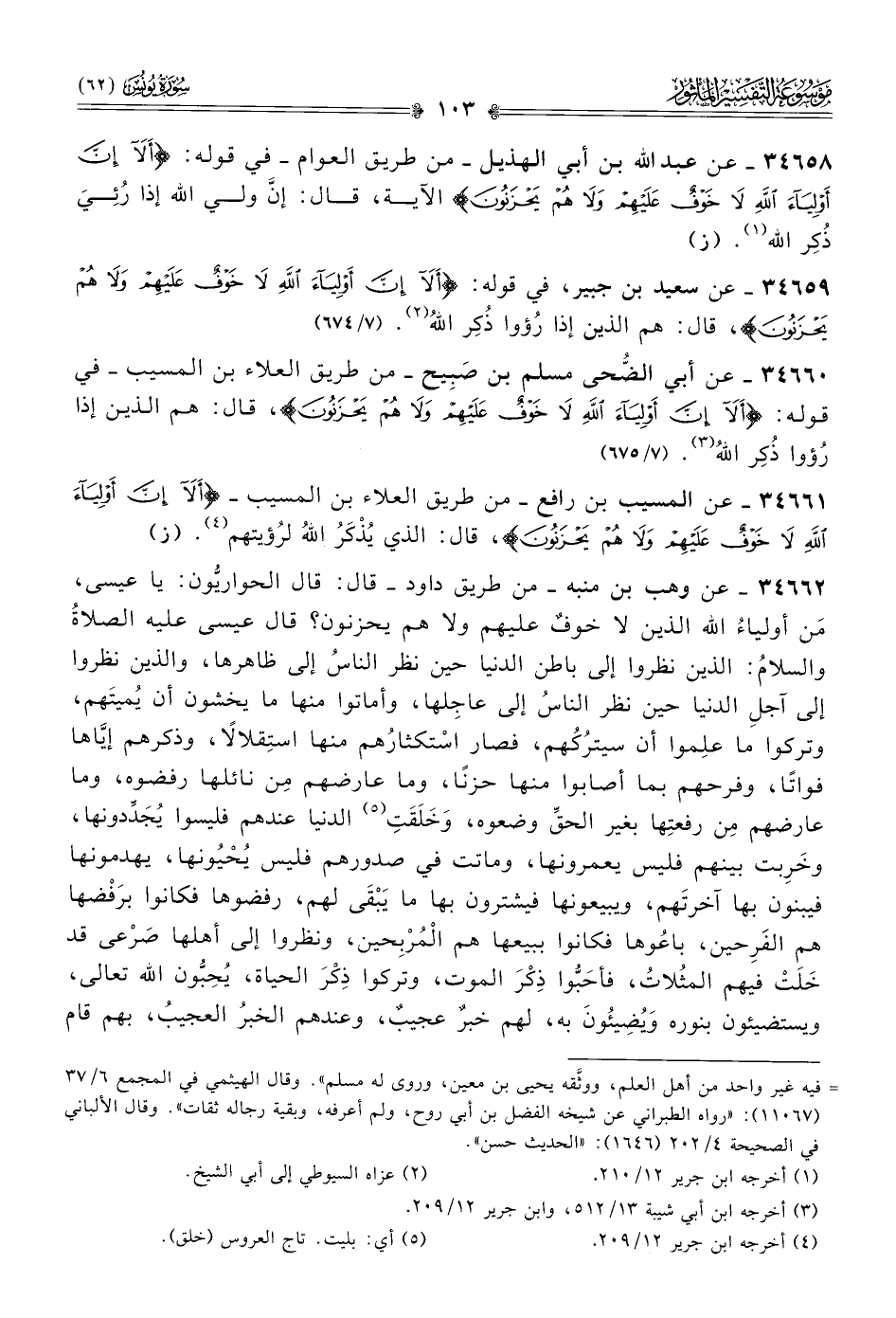 ٣٤٦٦٠ - عن أبي الضُّحى مسلم بن صَبِيح -من طريق العلاء بن المسيب- في قوله: {ألا إن أولياءَ اللهِ لا خوفٌ عليهم ولا هم يحزنون}، قال: هم الذين إذا رُؤوا ذُكِر اللهُ (¬٣). (٧/ ٦٧٥)