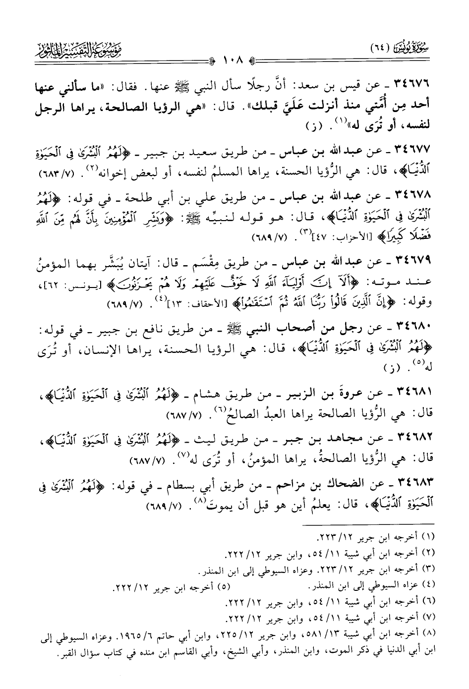 ٣٤٦٧٧ - عن عبد الله بن عباس -من طريق سعيد بن جبير- {لهم البُشرى في الحياة الدنيا}، قال: هي الرُّؤيا الحسنة، يراها المسلمُ لنفسه، أو لبعض إخوانه (¬٢). (٧/ ٦٨٣)