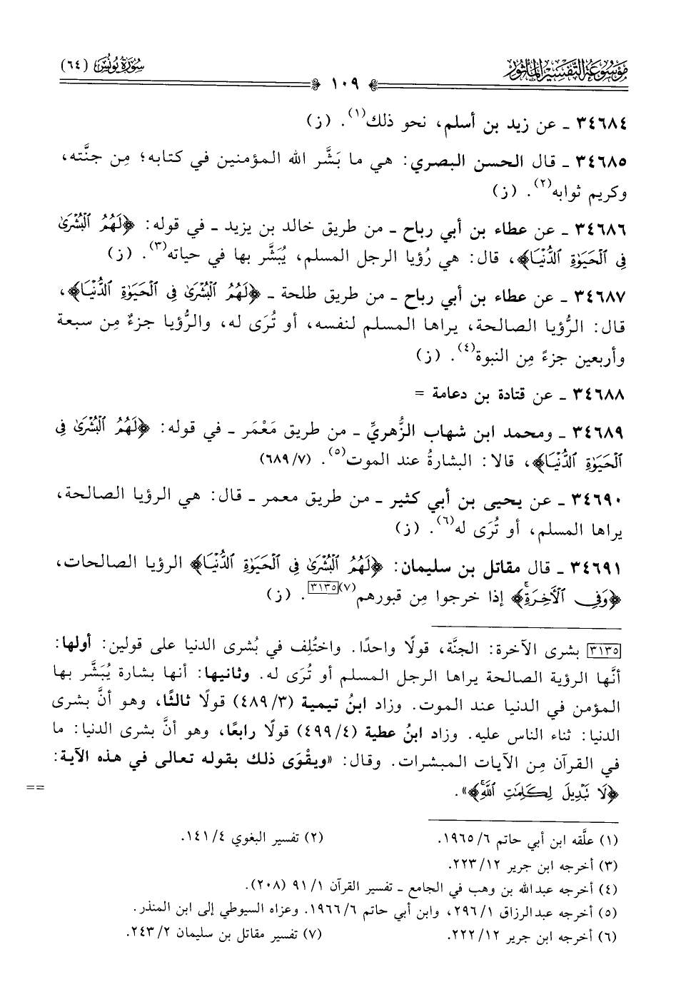 ٣٤٦٩١ - قال مقاتل بن سليمان: {لَهُمُ البُشْرى فِي الحَياةِ الدُّنْيا} الرؤيا الصالحات، {وفِي الآخِرَةِ} إذا خرجوا مِن قبورهم (¬٧) [٣١٣٥]. (ز)
