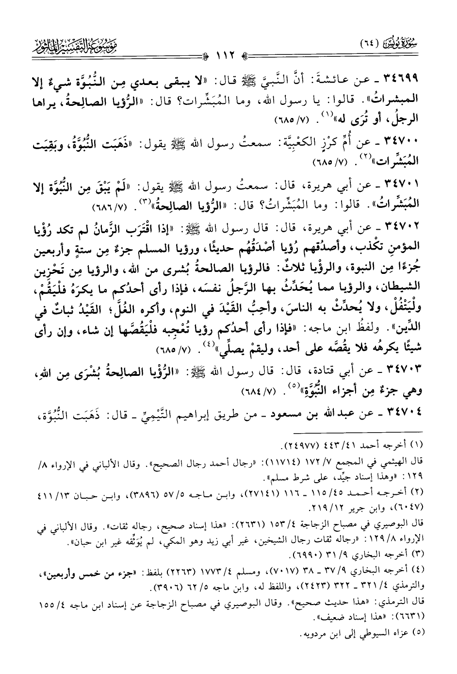 ٣٤٧٠٣ - عن أبي قتادة، قال: قال رسول الله - صلى الله عليه وسلم -: «الرُّؤْيا الصالِحةُ بُشْرى مِن اللهِ، وهي جزءٌ مِن أجزاء النُّبُوَّةِ» (¬٥). (٧/ ٦٨٤)