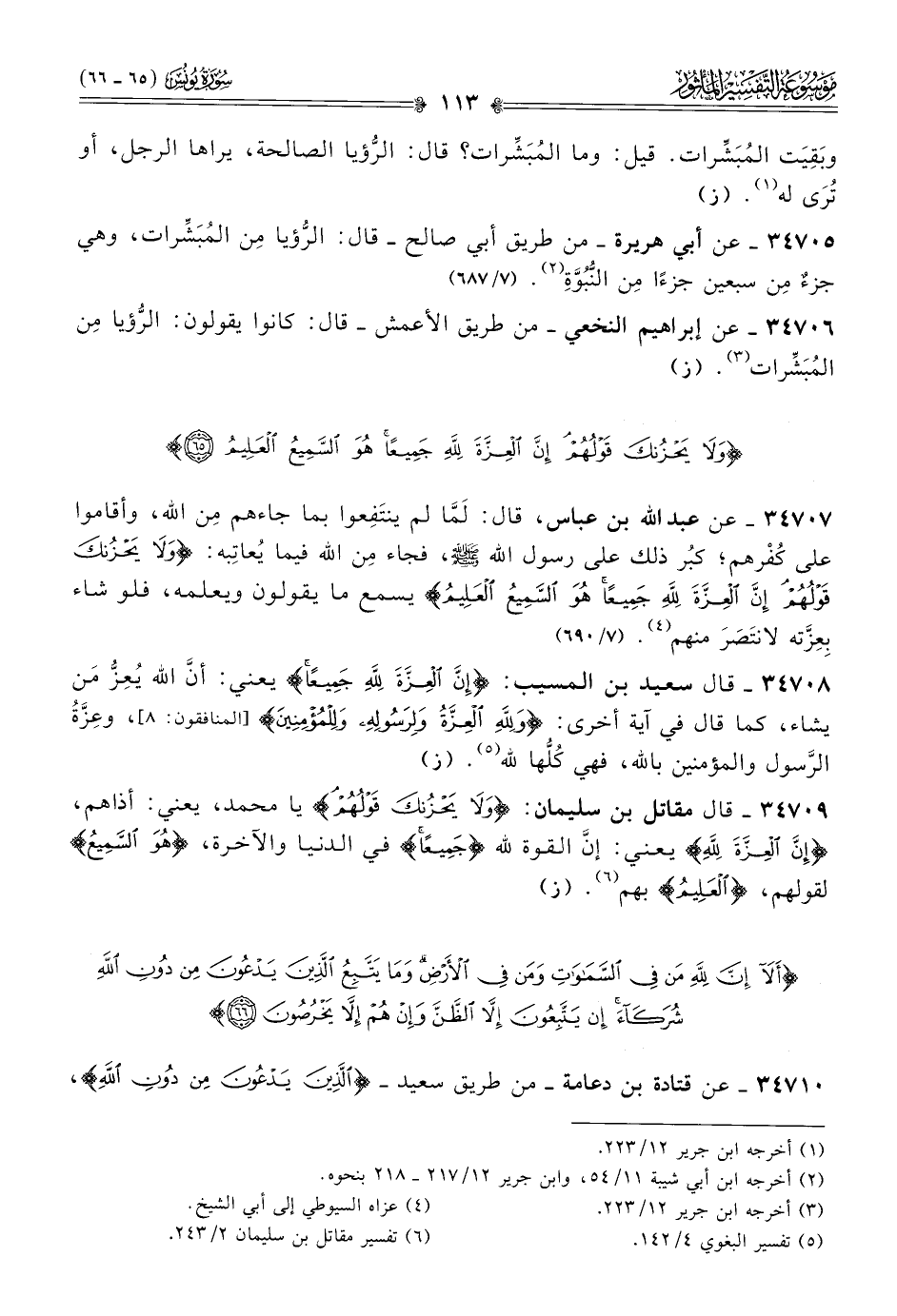 ٣٤٧٠٧ - عن عبد الله بن عباس، قال: لَمّا لم ينتَفِعوا بما جاءهم مِن الله، وأقاموا على كُفْرهم؛ كبُر ذلك على رسول الله - صلى الله عليه وسلم -، فجاء مِن الله فيما يُعاتِبه: {ولا يحزنك قولهم إن العزة لله جميعًا هو السَّميع العليمُ} يسمع ما يقولون ويعلمه، فلو شاء بِعِزَّته لانتَصَرَ منهم (¬٤). (٧/ ٦٩٠)