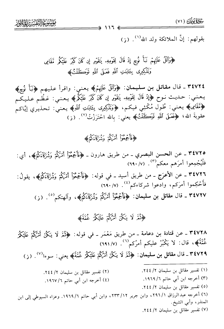 ٣٤٧٢٧ - قال مقاتل بن سليمان: {فَأَجْمِعُوا أمْرَكُمْ وشُرَكاءَكُمْ}، وآلهتكم (¬٥). (ز)