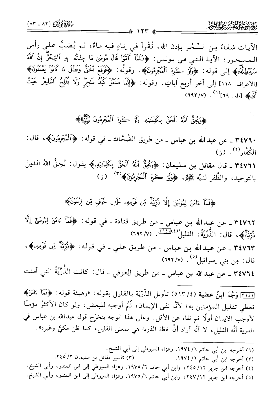 ٣٤٧٦٢ - عن عبد الله بن عباس -من طريق قتادة- في قوله: {فما آمن لموسى إلا ذرية}، قال: الذُّرِّيَّةُ: القليلُ (¬٤) [٣١٤١]. (٧/ ٦٩٢)