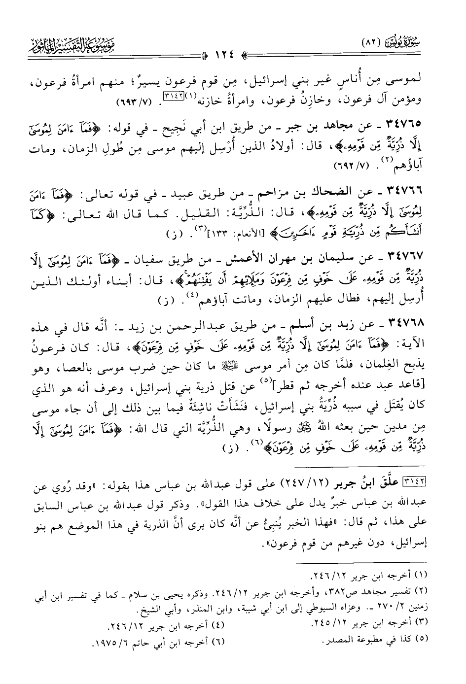 [٣١٤٢] علَّقَ ابنُ جرير (١٢/ ٢٤٧) على قول عبد الله بن عباس هذا بقوله: «وقد رُوي عن عبد الله بن عباس خبرٌ يدل على خلاف هذا القول». وذكر قول عبد الله بن عباس السابق على هذا، ثم قال: «فهذا الخبر يُنبِئُ عن أنّه كان يرى أنّ الذرية في هذا الموضع هم بنو إسرائيل، دون غيرهم من قوم فرعون».