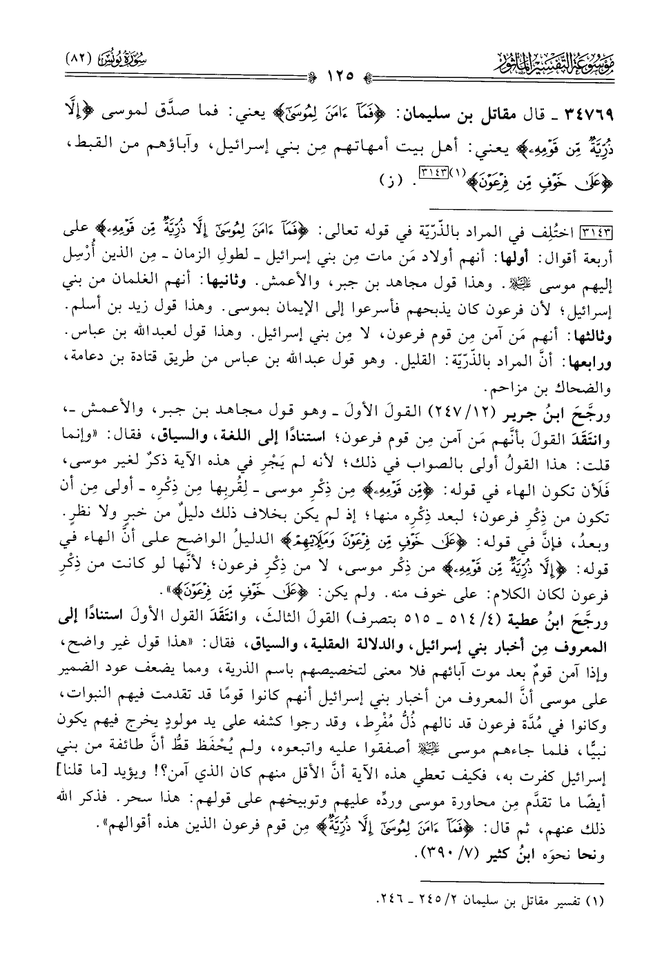 [٣١٤٣] اختُلِف في المراد بالذّرّيّة في قوله تعالى: {فَما آمَنَ لِمُوسى إلّا ذُرِّيَّةٌ مِن قَوْمِهِ} على أربعة أقوال: أولها: أنهم أولاد مَن مات مِن بني إسرائيل -لطولِ الزمان- مِن الذين أُرْسِل إليهم موسى - عليه السلام -. وهذا قول مجاهد بن جبر، والأعمش. وثانيها: أنهم الغلمان من بني إسرائيل؛ لأن فرعون كان يذبحهم فأسرعوا إلى الإيمان بموسى. وهذا قول زيد بن أسلم. وثالثها: أنهم مَن آمن مِن قوم فرعون، لا مِن بني إسرائيل. وهذا قول لعبد الله بن عباس. ورابعها: أنّ المراد بالذّرّيّة: القليل. وهو قول عبد الله بن عباس من طريق قتادة بن دعامة، والضحاك بن مزاحم.