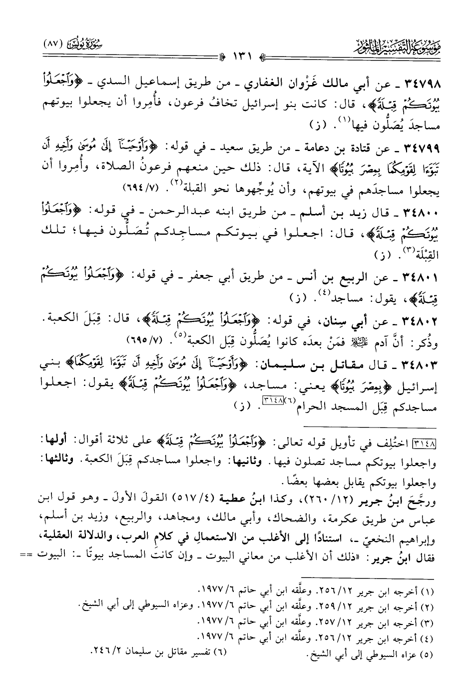 ٣٤٧٩٩ - عن قتادة بن دعامة -من طريق سعيد- في قوله: {وأوحينا إلى موسى وأخيه أن تبوآ لقومكما بمصر بيوتا} الآية، قال: ذلك حين منعهم فرعونُ الصلاة، وأُمِروا أن يجعلوا مساجدَهم في بيوتهم، وأن يُوجِّهوها نحو القبلة (¬٢). (٧/ ٦٩٤)