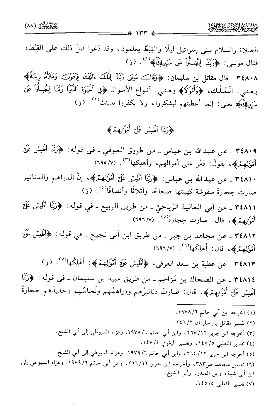 ٣٤٨١٠ - عن عبد الله بن عباس: {ربنا اطمس على أموالهم}، إنّ الدراهم والدنانير صارت حِجارةً منقوشة كهيئتها صحاحًا وأثلاثًا وأنصافًا (¬٤). (ز)