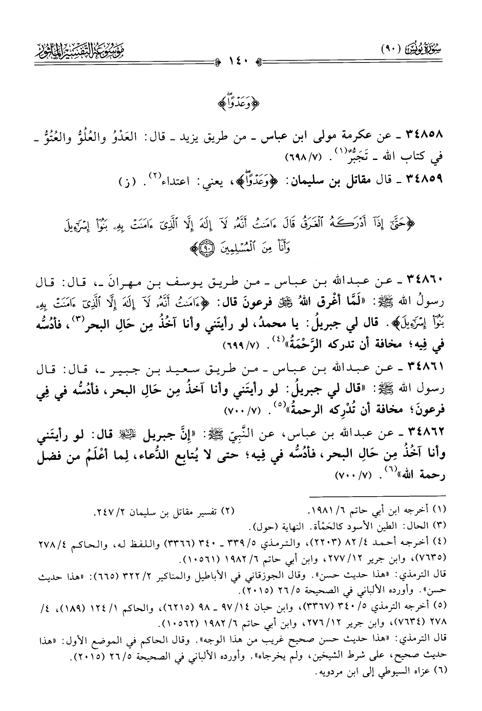٣٤٨٦٠ - عن عبد الله بن عباس - من طريق يوسف بن مهران -، قال: قال رسولُ الله - صلى الله عليه وسلم -: «لَمّا أغْرق اللهُ - عز وجل - فرعونَ قال: {آمنت أنه لا إله إلا الذي آمنت به بنو إسرائيل}. قال لي جبريلُ: يا محمدُ، لو رأيتَني وأنا آخُذُ مِن حالِ البحر (¬٣)، فأدُسُّه في فِيه؛ مخافة أن تدركه الرَّحْمَةُ» (¬٤). (٧/ ٦٩٩)