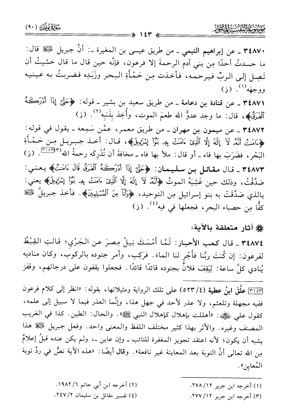 [٣١٥٣] علَّقَ ابنُ عطية (٤/ ٥٢٣) على تلك الرواية ومثيلاتها، بقوله: «انظر إلى كلام فرعون ففيه مجهلة وتلعثم، ولا عذر لأحد في جهل هذا، وإنّما العذر فيما لا سبيل إلى علمه، كقول علي - رضي الله عنهما -: «أهللت بإهلال كإهلال النبي - صلى الله عليه وسلم -». والحال: الطين. كذا في الغريب المصنف وغيره. والأثر بهذا كثير مختلف اللفظ والمعنى واحد. وفعل جبريل - عليه السلام - هذا يشبه أن يكون؛ لأنه اعتقد تجويز المغفرة للتائب -وإن عاين-، ولم يكن عنده قبلُ إعلامٌ مِن الله تعالى أنّ التوبة بعد المعاينة غير نافعة». وقال أيضًا: «هذه الآية نصٌّ في ردِّ توبة المُعايِن».