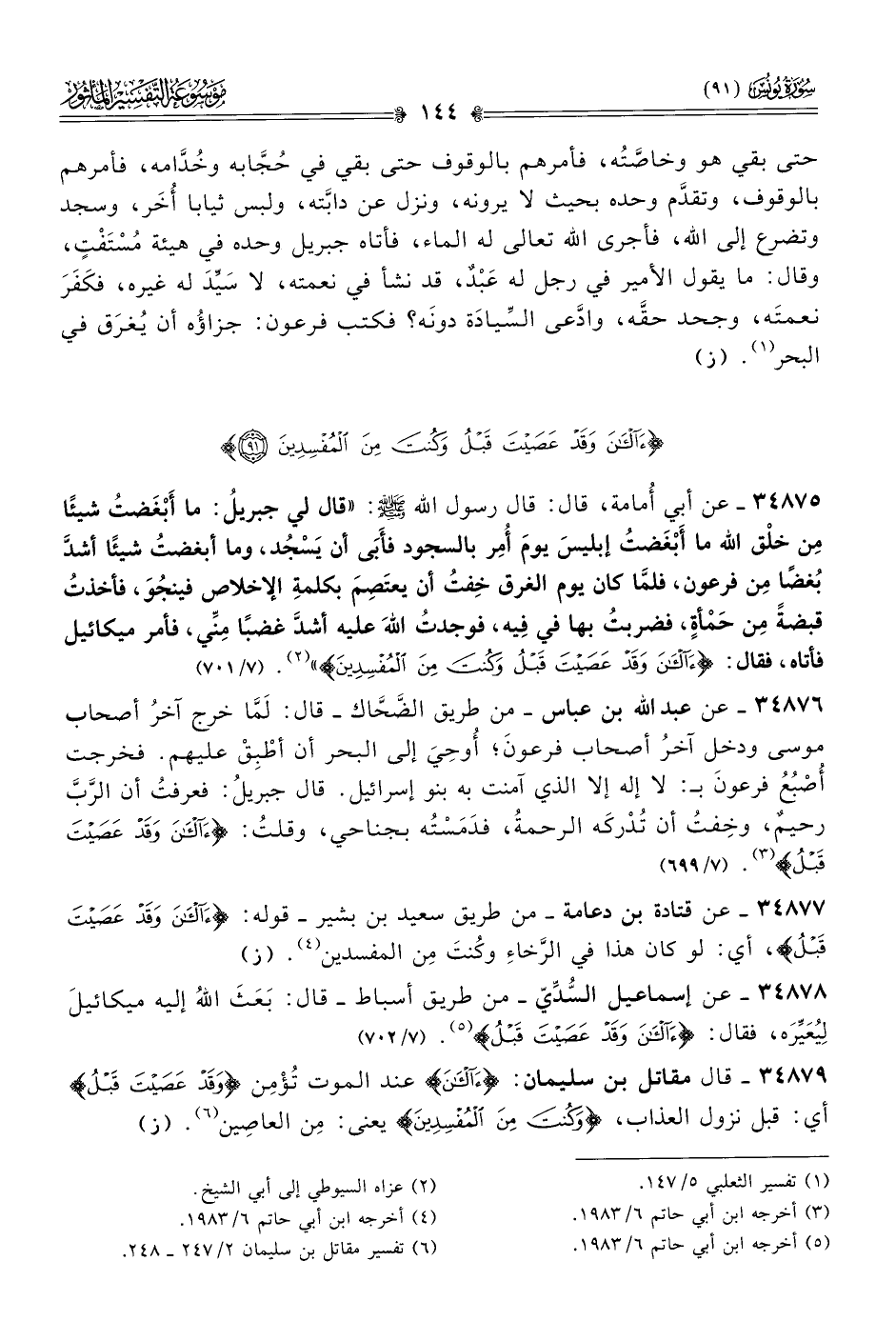 ٣٤٨٧٦ - عن عبد الله بن عباس -من طريق الضَّحّاك- قال: لَمّا خرج آخرُ أصحاب موسى ودخل آخرُ أصحاب فرعونَ؛ أُوحِيَ إلى البحر أن أطْبِقْ عليهم. فخرجت أُصْبُعُ فرعونَ بـ: لا إله إلا الذي آمنت به بنو إسرائيل. قال جبريلُ: فعرفتُ أن الرَّبَّ رحيمٌ، وخِفتُ أن تُدْركَه الرحمةُ، فدَمَسْتُه بجناحي، وقلتُ: {آلآن وقد عصيت قبل} (¬٣). (٧/ ٦٩٩)