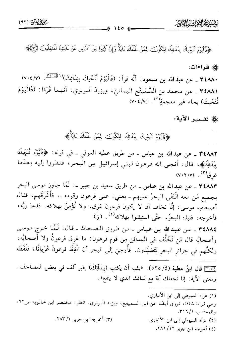 ٣٤٨٨٢ - عن عبد الله بن عباس -من طريق عطية العوفي- في قوله: {فاليوم ننجيك ببدنك}، قال: أنجى الله فرعون لبني إسرائيل مِن البحر، فنظروا إليه بعدَما غرِق (¬٣). (٧/ ٧٠٢)