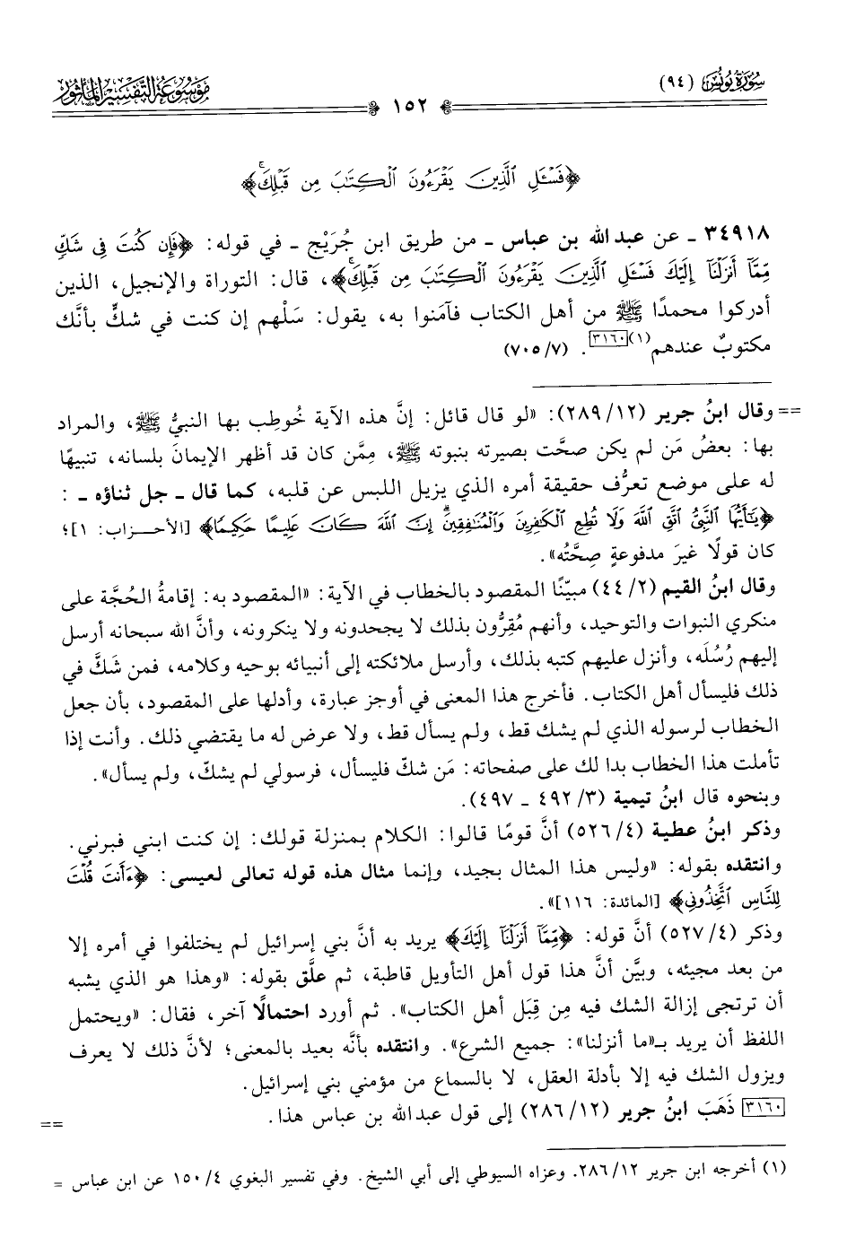 ٣٤٩١٨ - عن عبد الله بن عباس -من طريق ابن جُرَيْج- في قوله: {فإن كنتَ في شكٍ مما أنزلنا إليك فسئل الذين يقرؤون الكتاب من قبلكَ}، قال: التوراة والإنجيل، الذين أدركوا محمدًا - صلى الله عليه وسلم - من أهل الكتاب فآمَنوا به، يقول: سَلْهم إن كنت في شكٍّ بأنّك مكتوبٌ عندهم (¬١) [٣١٦٠]. (٧/ ٧٠٥)