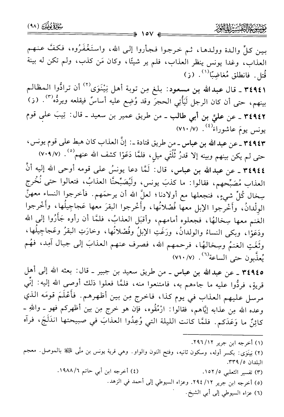 ٣٤٩٤٤ - عن عبد الله بن عباس، قال: لَمّا دعا يونسُ على قومه أوحى الله إليه أنّ العذاب مُصَبِّحهم، فقالوا: ما كذبَ يونس، ولَيُصَبِّحنّا العذابُ، فتعالوا حتى نُخْرج سِخال كُلِّ شيءٍ، فنجعلها مع أولادنا؛ لعلَّ الله أن يرحمَهم. فأخرجوا النساء معهنَّ الوِلْدانُ، وأَخْرجوا الإبل معها فُصْلانُها، وأَخْرجوا البقرَ معها عَجاجِيلُها، وأَخْرجوا الغنم معها سِخالهُا، فجعلوه أمامهم، وأقبَل العذابُ، فلمّا أن رأوه جَأَرُوا إلى الله ودَعَوْا، وبكى النساءُ والولدانُ، ورَغَتِ الإبلُ وفُصْلانُها، وخارَتِ البقرُ وعَجاجِيلُها، وثَغَتِ الغنمُ وسِخالهُا، فرحمهم الله، فصرف عنهم العذابَ إلى جبال آمِد، فهُم يُعذَّبون حتى الساعة (¬٦). (٧/ ٧٠١٠)