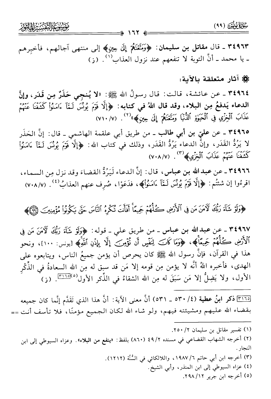 ٣٤٩٦٥ - عن عليّ بن أبي طالب -من طريق أبي علقمة الهاشمي- قال: إنّ الحَذَر لا يَرُدُّ القَدَر، وإنّ الدعاء يَرُدُّ القَدَر، وذلك في كتاب الله: {إلّا قوم يُونُس لمّا آمنوا كشفنا عنهم عذاب الخزي} (¬٣). (٧/ ٧٠٨)