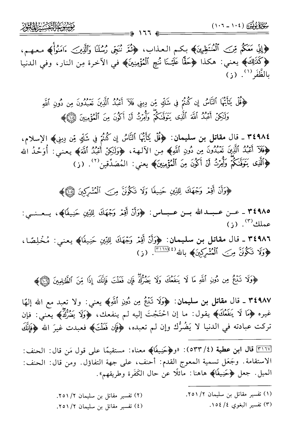[٣١٦٧] قال ابن عطية (٤/ ٥٣٣): «و {حنيفا} معناه: مستقيمًا على قول مَن قال: الحنف: الاستقامة. وجَعَل تسمية المعوج القدم: أحنف، على جهة التفاؤل. ومن قال: الحنف: الميل. جعل {حنيفا} هاهنا: مائلًا عن حال الكَفَرة وطريقهم».