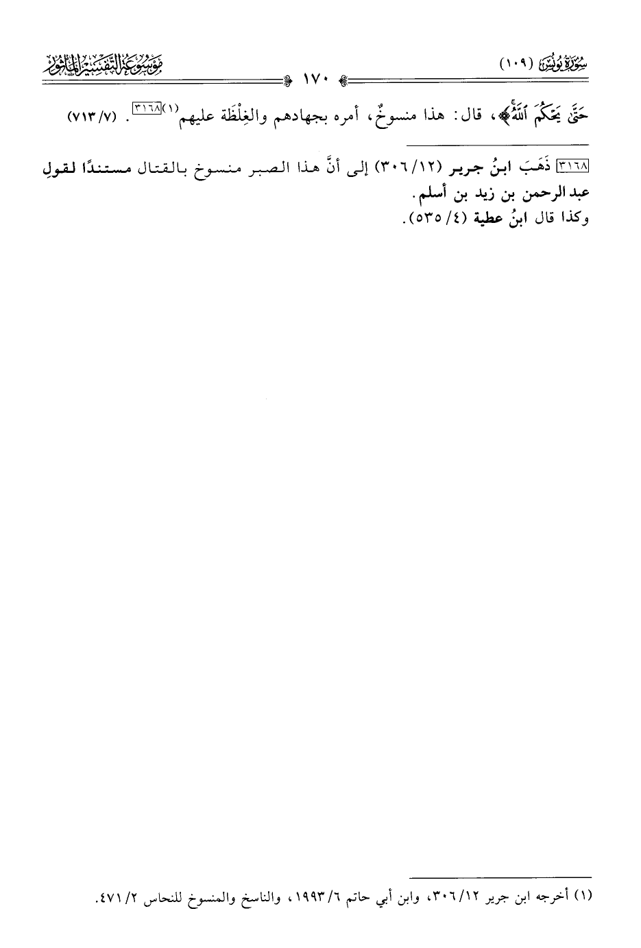 [٣١٦٨] ذَهَبَ ابنُ جرير (١٢/ ٣٠٦) إلى أنّ هذا الصبر منسوخ بالقتال مستندًا لقولِ عبد الرحمن بن زيد بن أسلم.