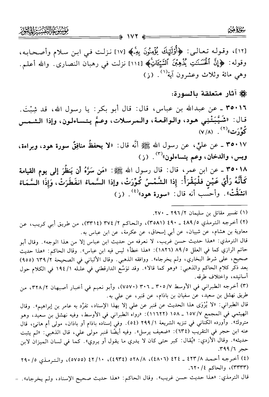 ٣٥٠١٦ - عن عبد الله بن عباس، قال: قال أبو بكر: يا رسول الله، قد شِبْتَ. قال: «شَيَّبَتْنِي هود، والواقعة، والمرسلات، وعمَّ يتساءلون، وإذا الشمس كُوِّرَت» (¬٢). (٨/ ٧)