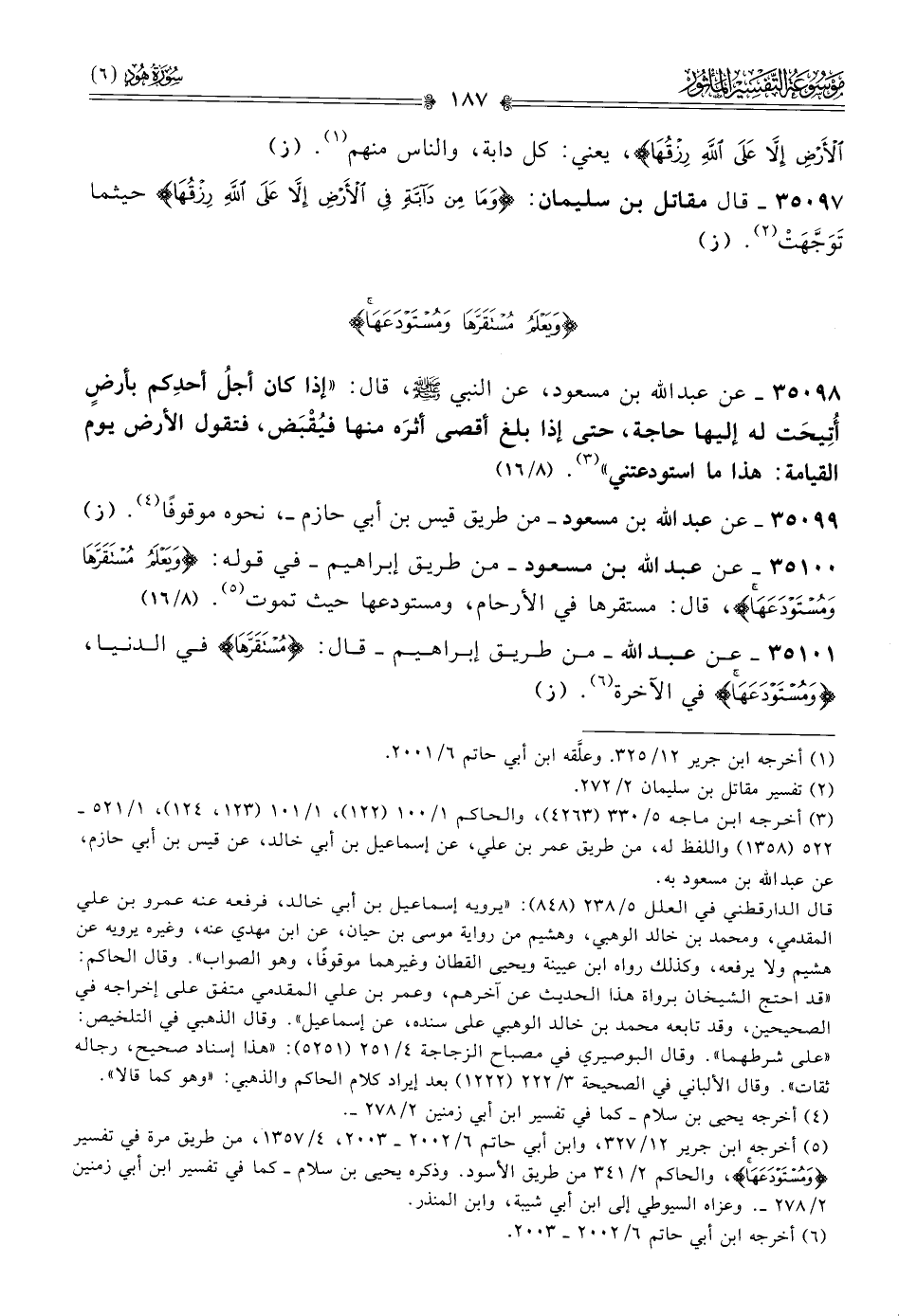 ٣٥١٠٠ - عن عبد الله بن مسعود -من طريق إبراهيم- في قوله: {ويعلم مستقرها ومستودعها}، قال: مستقرها في الأرحام، ومستودعها حيث تموت (¬٥). (٨/ ١٦)