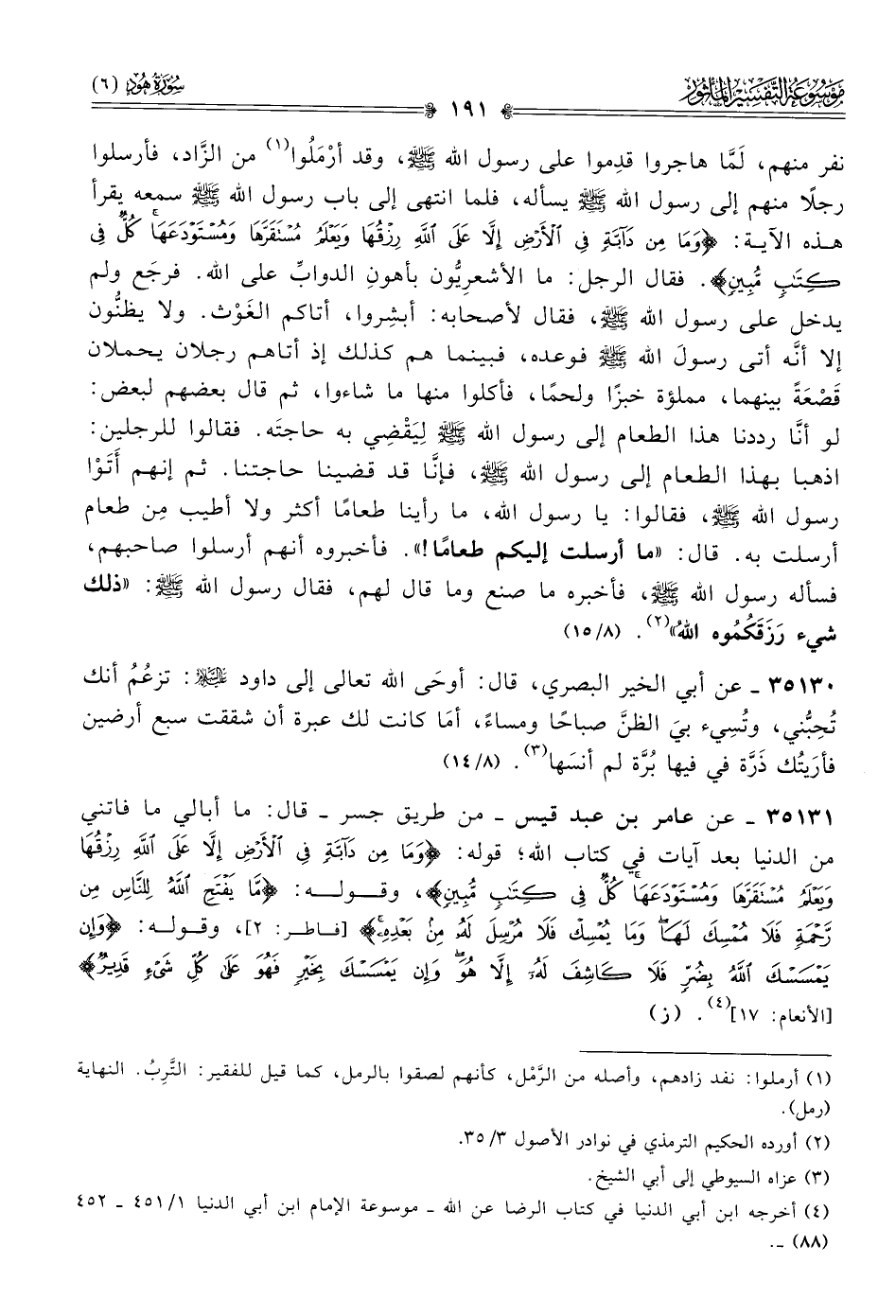 نفر منهم، لَمّا هاجروا قدِموا على رسول الله - صلى الله عليه وسلم -، وقد أرْمَلُوا (¬١) من الزّاد، فأرسلوا رجلًا منهم إلى رسول الله - صلى الله عليه وسلم - يسأله، فلما انتهى إلى باب رسول الله - صلى الله عليه وسلم - سمعه يقرأ هذه الآية: {وما من دابة في الأرض إلا على الله رزقها ويعلم مستقرها ومستودعها كل في كتاب مبين}. فقال الرجل: ما الأشعرِيُّون بأهونِ الدوابِّ على الله. فرجَع ولم يدخل على رسول الله - صلى الله عليه وسلم -، فقال لأصحابه: أبشِروا، أتاكم الغَوْث. ولا يظنُّون إلا أنّه أتى رسولَ الله - صلى الله عليه وسلم - فوعده، فبينما هم كذلك إذ أتاهم رجلان يحملان قَصْعَةً بينهما، مملؤة خبزًا ولحمًا، فأكلوا منها ما شاءوا، ثم قال بعضهم لبعض: لو أنّا رددنا هذا الطعام إلى رسول الله - صلى الله عليه وسلم - لِيَقْضِي به حاجتَه. فقالوا للرجلين: اذهبا بهذا الطعام إلى رسول الله - صلى الله عليه وسلم -، فإنّا قد قضينا حاجتنا. ثم إنهم أتَوْا رسول الله - صلى الله عليه وسلم -، فقالوا: يا رسول الله، ما رأينا طعامًا أكثر ولا أطيب مِن طعام أرسلت به. قال: «ما أرسلت إليكم طعامًا!». فأخبروه أنهم أرسلوا صاحبهم، فسأله رسول الله - صلى الله عليه وسلم -، فأخبره ما صنع وما قال لهم، فقال رسول الله - صلى الله عليه وسلم -: «ذلك شيء رَزَقَكُمُوه اللهُ» (¬٢). (٨/ ١٥)