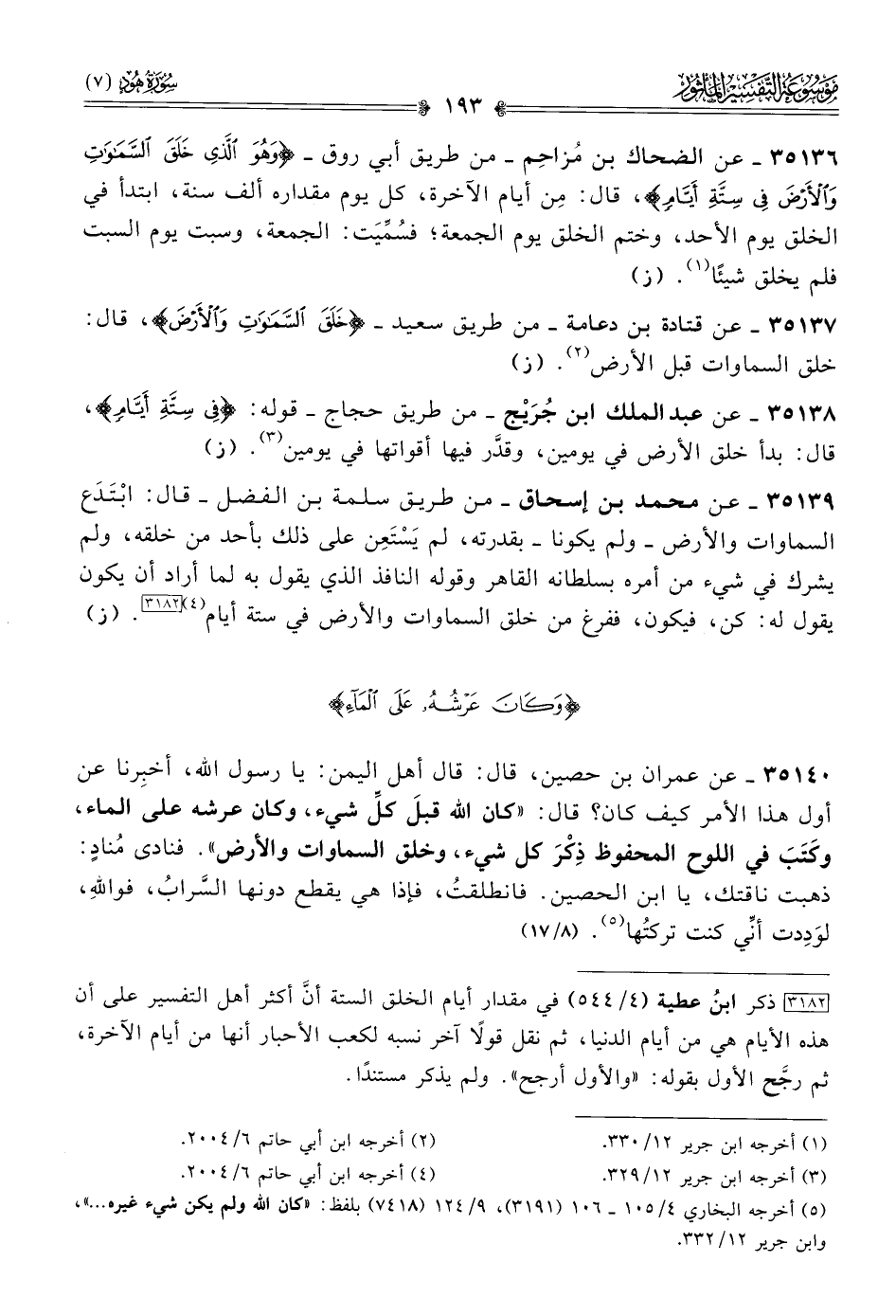 [٣١٨٢] ذكر ابنُ عطية (٤/ ٥٤٤) في مقدار أيام الخلق الستة أنّ أكثر أهل التفسير على أن هذه الأيام هي من أيام الدنيا، ثم نقل قولًا آخر نسبه لكعب الأحبار أنها من أيام الآخرة، ثم رجَّح الأول بقوله: «والأول أرجح». ولم يذكر مستندًا.