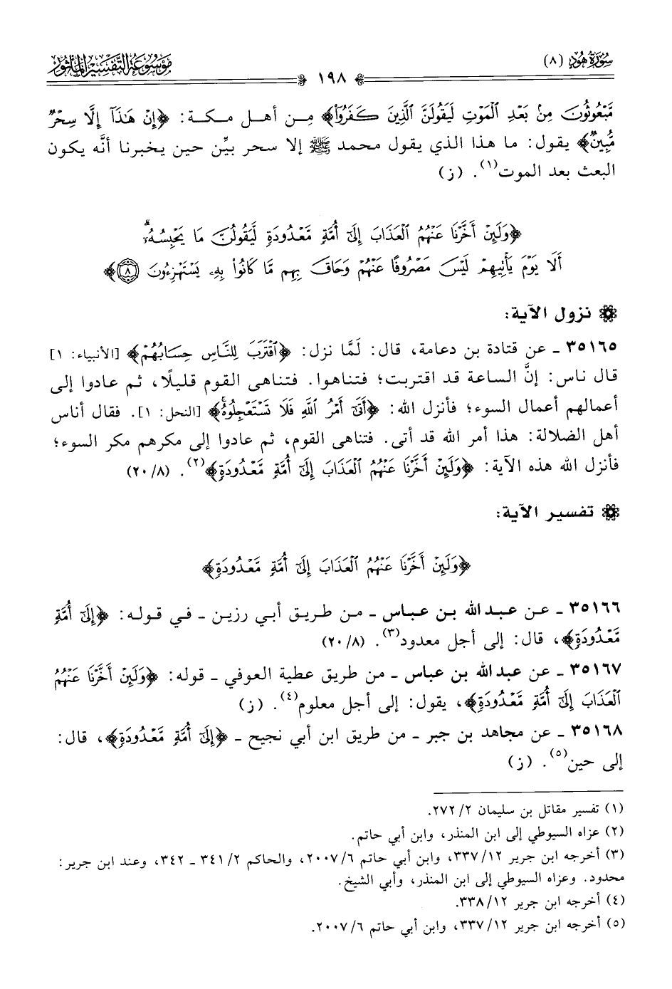 {وَلَئِنْ أَخَّرْنَا عَنْهُمُ الْعَذَابَ إِلَى أُمَّةٍ مَعْدُودَةٍ لَيَقُولُنَّ مَا يَحْبِسُهُ أَلَا يَوْمَ يَأْتِيهِمْ لَيْسَ مَصْرُوفًا عَنْهُمْ وَحَاقَ بِهِمْ مَا كَانُوا بِهِ يَسْتَهْزِئُونَ (٨)}