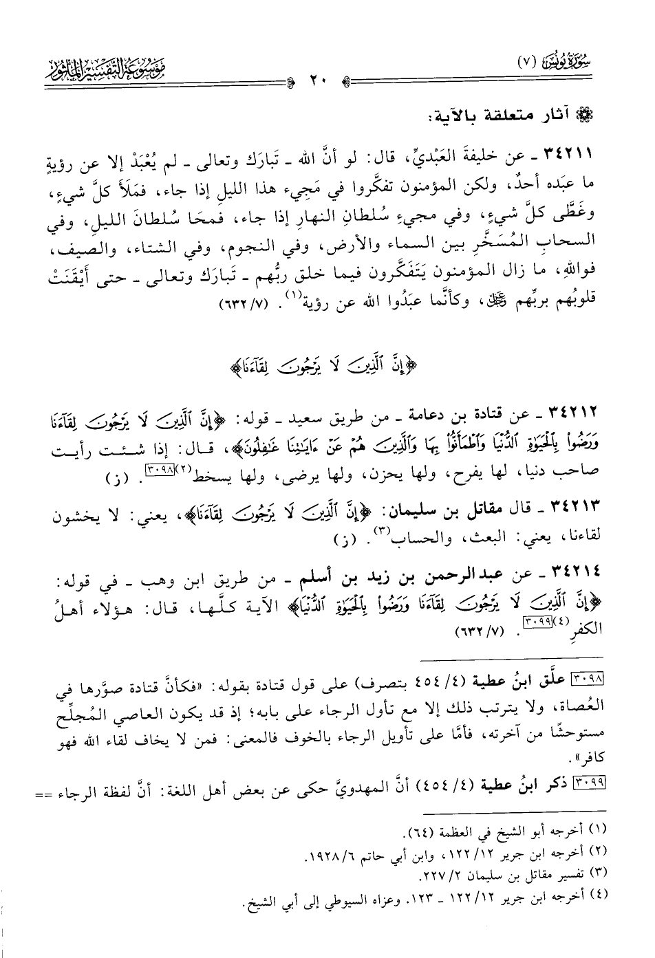 ٣٤٢١٤ - عن عبد الرحمن بن زيد بن أسلم -من طريق ابن وهب- في قوله: {إنّ الَّذِينَ لا يَرجُونَ لِقَآءَنا ورَضُوا بِالحَياةِ الدُّنيا} الآية كلَّها، قال: هؤلاء أهلُ الكفرِ (¬٤) [٣٠٩٩]. (٧/ ٦٣٢)