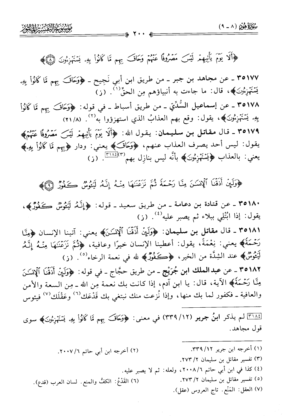 [٣١٨٤] لم يذكر ابنُ جرير (١٢/ ٣٣٩) في معنى: {وحاق بهم ما كانوا به يستهزؤون} سوى قول مجاهد.