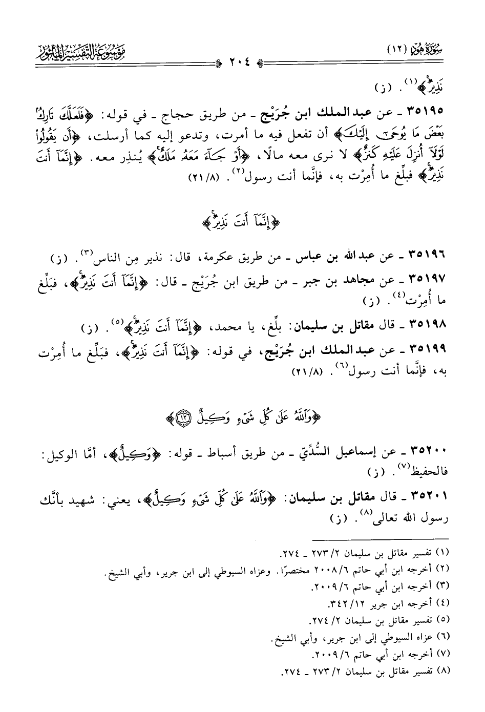 ٣٥١٩٥ - عن عبد الملك ابن جُرَيْج -من طريق حجاج- في قوله: {فلعلك تارك بعض ما يوحى إليك} أن تفعل فيه ما أمرت، وتدعو إليه كما أرسلت، {أن يقولوا لولا أُنزل عليه كنز} لا نرى معه مالًا، {أو جاء معه ملك} يُنذِر معه. {إنما أنت نذير} فبلِّغ ما أُمِرْت به، فإنّما أنت رسول (¬٢). (٨/ ٢١)