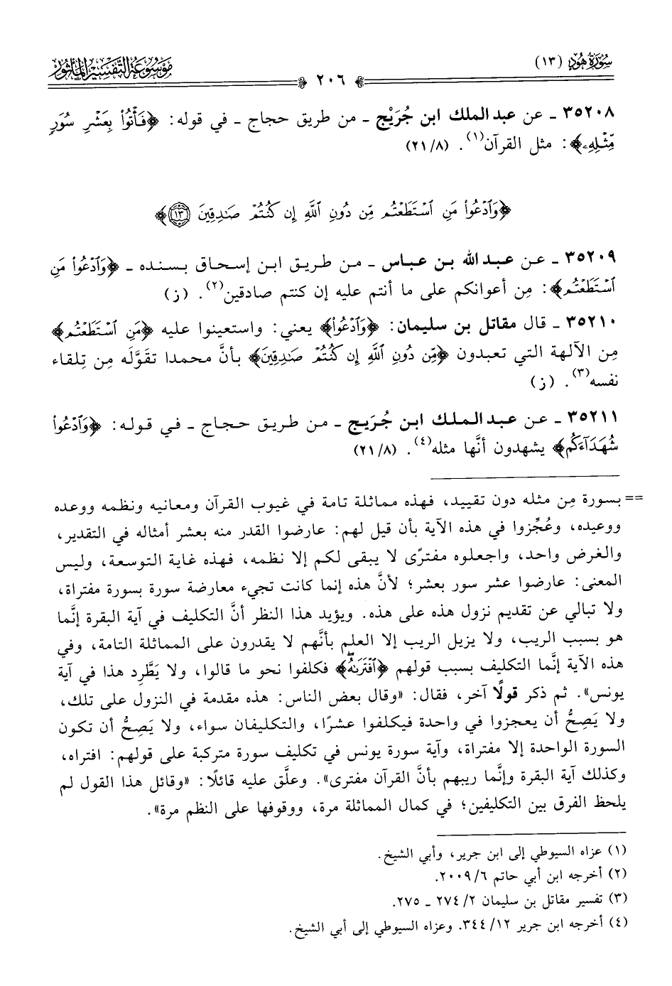٣٥٢٠٨ - عن عبد الملك ابن جُرَيْج -من طريق حجاج- في قوله: {فأتوا بعشر سور مثله}: مثل القرآن (¬١). (٨/ ٢١)