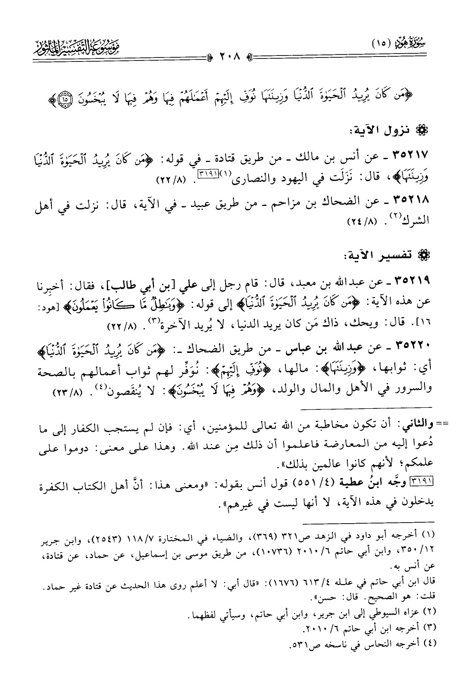 ٣٥٢٢٠ - عن عبد الله بن عباس -من طريق الضحاك-: {من كان يريد الحياة الدنيا} أي: ثوابها، {وزينتها}: مالها، {نُوَفِّ إليهم}: نُوَفِّر لهم ثواب أعمالهم بالصحة والسرور في الأهل والمال والولد، {وهم فيها لا يبخسون}: لا يُنقَصون (¬٤). (٨/ ٢٣)
