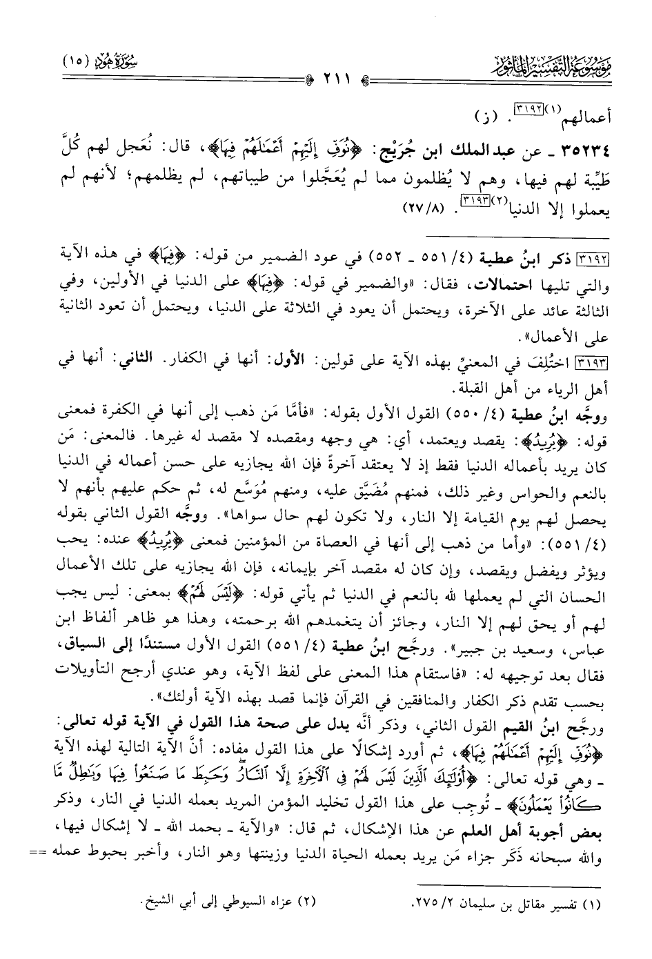 ٣٥٢٣٤ - عن عبد الملك ابن جُرَيْج: {نوف إليهم أعمالهم فيها}، قال: نُعَجل لهم كُلَّ طَيِّبة لهم فيها، وهم لا يُظلمون مما لم يُعَجَّلوا من طيباتهم، لم يظلمهم؛ لأنهم لم يعملوا إلا الدنيا (¬٢) [٣١٩٣]. (٨/ ٢٧)