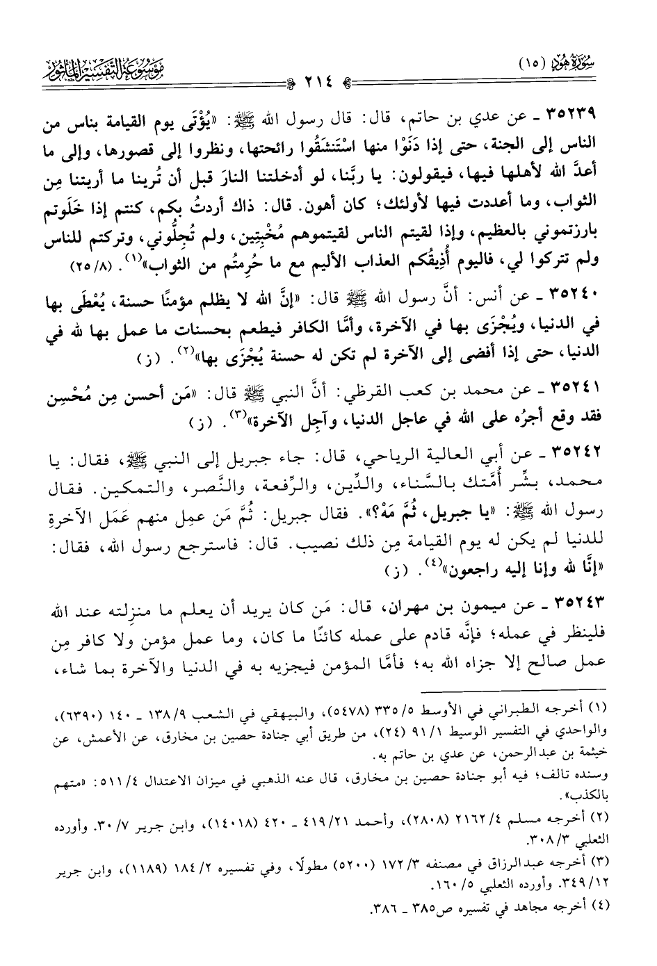 ٣٥٢٤٠ - عن أنس، أنّ رسول الله - صلى الله عليه وسلم - قال: «إنّ الله لا يظلم مؤمنًا حسنة، يُعْطى بها في الدنيا، ويُجْزى بها في الآخرة، وأمّا الكافر فيطعم بحسنات ما عمل بها لله في الدنيا، حتى إذا أفضى إلى الآخرة لم تكن له حسنة يُجْزى بها» (¬٢). (ز)