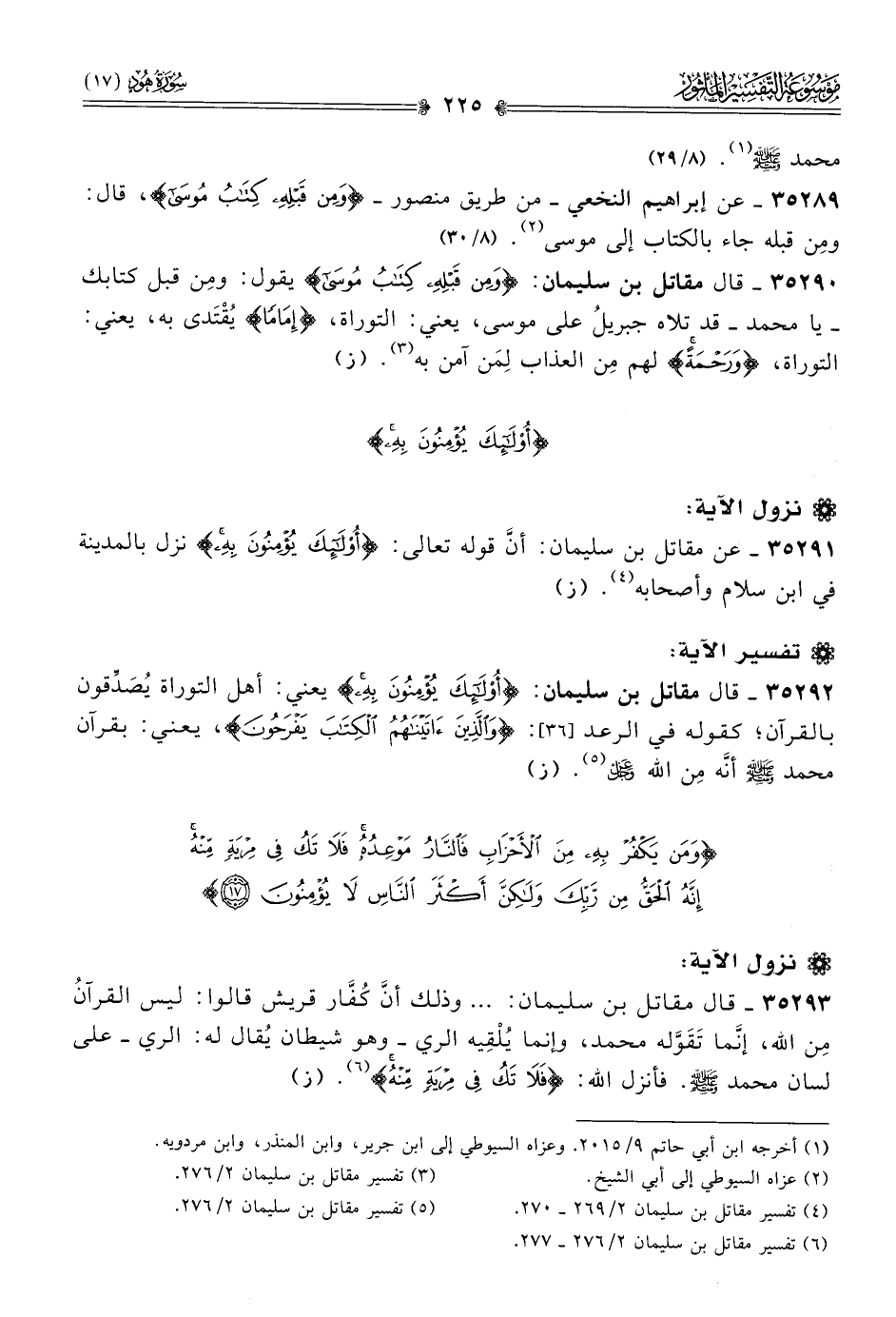 ٣٥٢٩١ - عن مقاتل بن سليمان: أنّ قوله تعالى: {أُولئِكَ يُؤْمِنُونَ بِهِ} نزل بالمدينة في ابن سلام وأصحابه (¬٤). (ز)