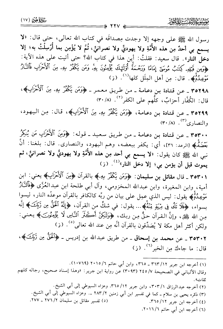٣٥٢٩٩ - عن قتادة بن دعامة، {ومن يكفر به من الأحزاب}، قال: مِن اليهود، والنصارى (¬٣). (٨/ ٣٠)
