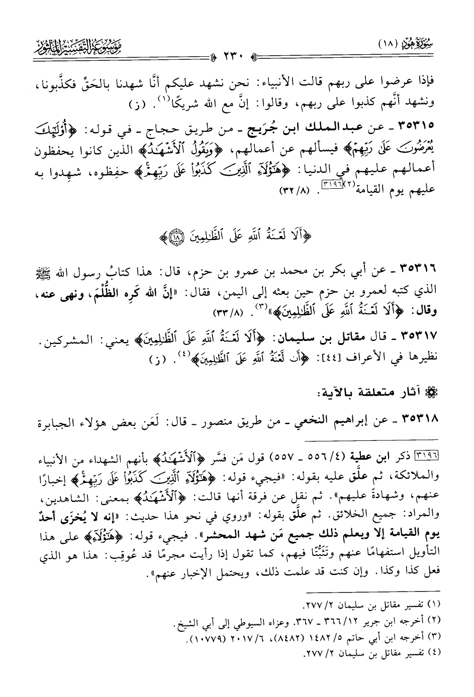 ٣٥٣١٥ - عن عبد الملك ابن جُرَيج -من طريق حجاج- في قوله: {أولئك يعرضون على ربهم} فيسألهم عن أعمالهم، {ويقول الأشهاد} الذين كانوا يحفظون أعمالهم عليهم في الدنيا: {هؤلاء الذين كذبوا على ربهم} حفِظوه، شهِدوا به عليهم يوم القيامة (¬٢) [٣١٩٦]. (٨/ ٣٢)