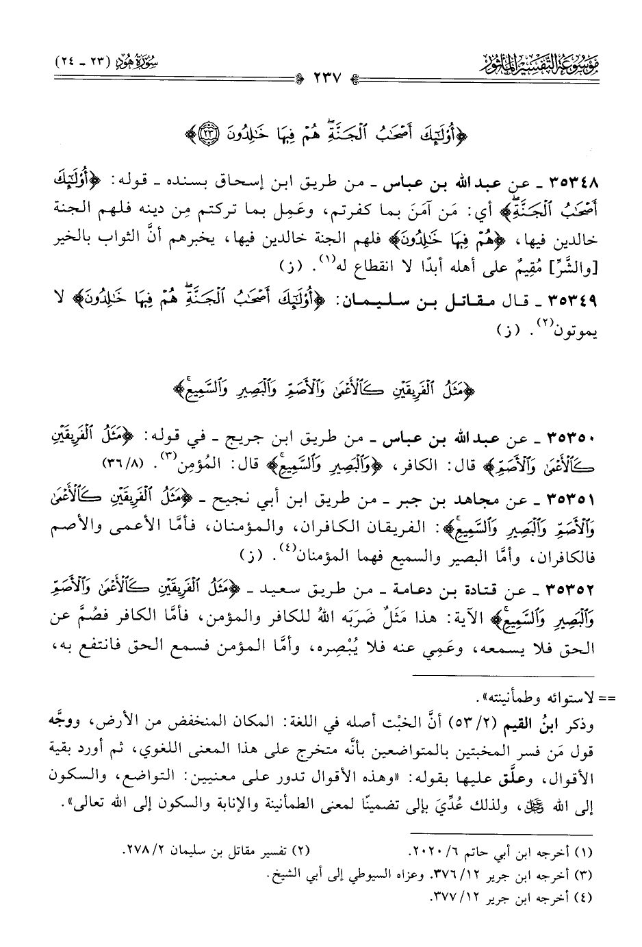 ٣٥٣٥٠ - عن عبد الله بن عباس -من طريق ابن جريج- في قوله: {مثل الفريقين كالأعمى والأصم} قال: الكافر، {والبصير والسميع} قال: المُؤمِن (¬٣). (٨/ ٣٦)