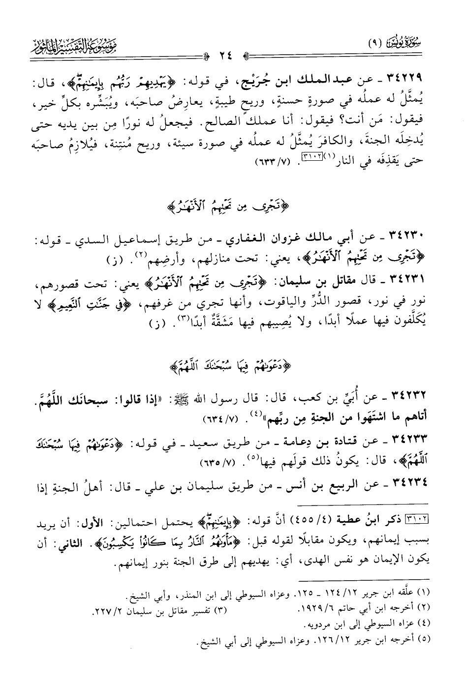 ٣٤٢٣١ - قال مقاتل بن سليمان: {تَجْرِي مِن تَحْتِهِمُ الأَنْهارُ} يعني: تحت قصورهم، نور في نور، قصور الدُّرِّ والياقوت، وأنها تجري من غرفهم، {فِي جَنّاتِ النَّعِيمِ} لا يُكَلَّفون فيها عملًا أبدًا، ولا يُصِيبهم فيها مَشَقَّةٌ أبدًا (¬٣). (ز)