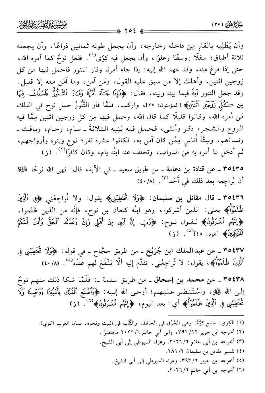 ٣٥٤٣٥ - عن قتادة بن دعامة -من طريق سعيد- في الآية، قال: نهى الله نوحًا - عليه السلام - أن يُراجِعه بعد ذلك في أحَد (¬٣). (٨/ ٤٠)