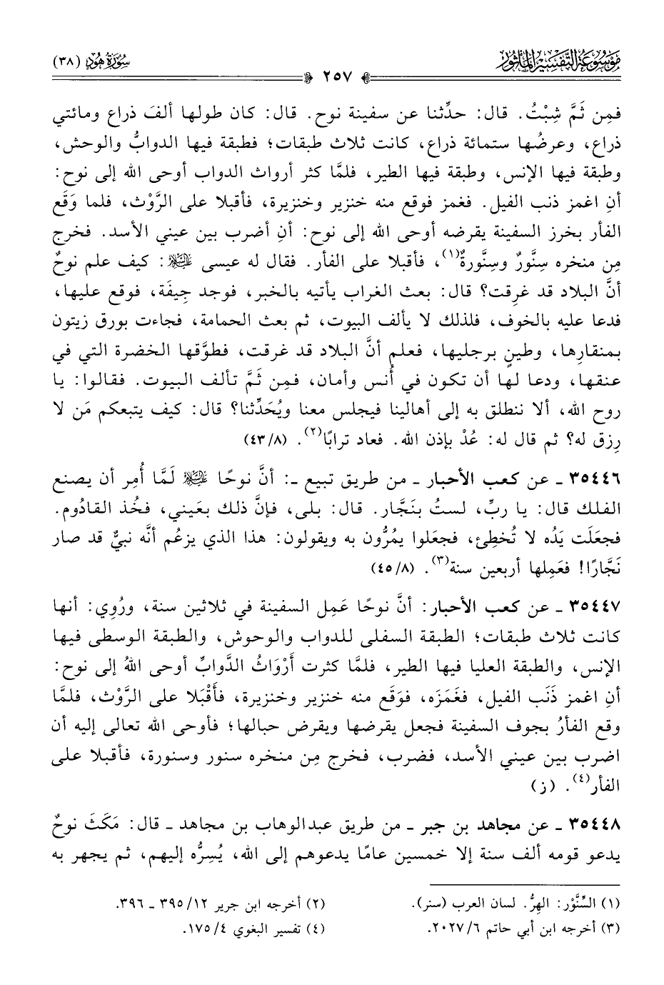 ٣٥٤٤٧ - عن كعب الأحبار: أنّ نوحًا عَمِل السفينة في ثلاثين سنة، ورُوِي: أنها كانت ثلاث طبقات؛ الطبقة السفلى للدواب والوحوش، والطبقة الوسطى فيها الإنس، والطبقة العليا فيها الطير، فلمّا كثرت أرْواثُ الدَّوابِّ أوحى اللهُ إلى نوح: أنِ اغمز ذَنَب الفيل، فغَمَزَه، فوَقَع منه خنزير وخنزيرة، فأَقْبَلا على الرَّوْث، فلمّا وقع الفأرُ بجوف السفينة فجعل يقرضها ويقرض حبالها؛ فأوحى الله تعالى إليه أن اضرب بين عيني الأسد، فضرب، فخرج مِن منخره سنور وسنورة، فأقبلا على الفأر (¬٤). (ز)
