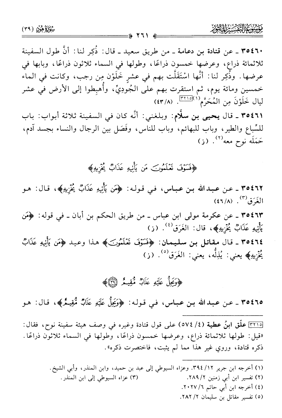 ٣٥٤٦٠ - عن قتادة بن دعامة -من طريق سعيد- قال: ذُكِر لنا: أنّ طول السفينة ثلاثمائة ذراع، وعرضها خمسون ذراعًا، وطولها في السماء ثلاثون ذراعًا، وبابها في عرضها. وذُكِر لنا: أنّها اسْتَقَلَّت بهم في عشرٍ خَلَوْن مِن رجب، وكانت في الماء خمسين ومائة يوم، ثم استقرت بهم على الجُودِيِّ، وأُهبِطوا إلى الأرض في عشر ليال خَلَوْنَ مِن المُحَرَّم (¬١) [٣٢١٥]. (٨/ ٤٣)