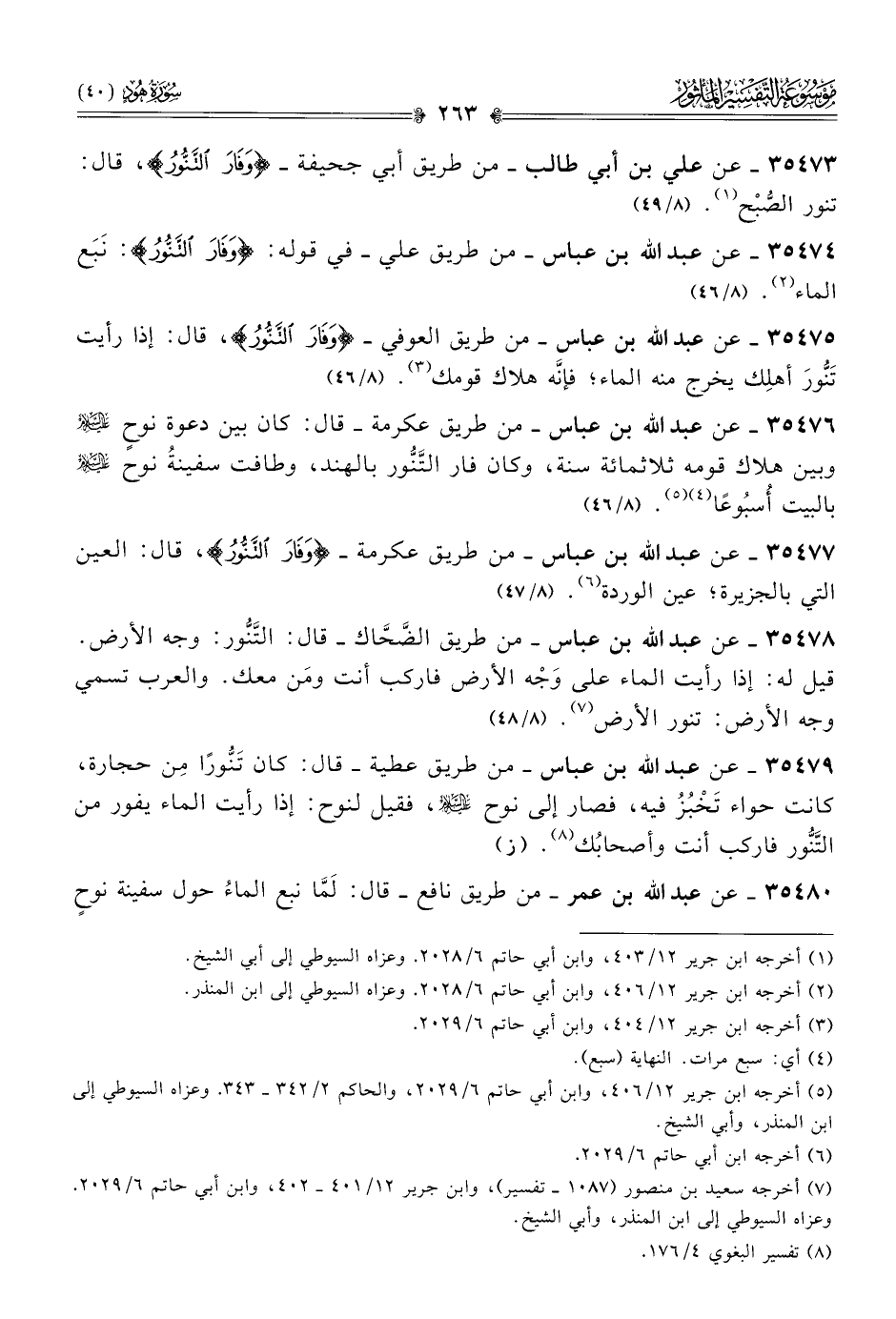٣٥٤٧٨ - عن عبد الله بن عباس -من طريق الضَّحّاك- قال: التَّنُّور: وجه الأرض. قيل له: إذا رأيت الماء على وجْه الأرض فاركب أنت ومَن معك. والعرب تسمي وجه الأرض: تنور الأرض (¬٧). (٨/ ٤٧)
